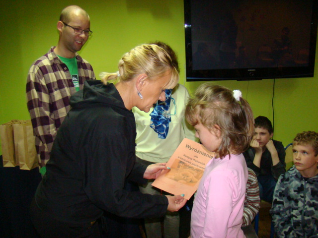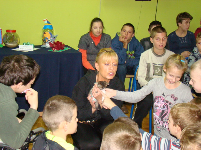 Wyniki konkursu ogłoszono podczas spotkania z niecodziennymi gośćmi, którzy 6 października odwiedzili naszą szkołę. Dzięki życzliwości pani Iwonie Kostrzewa-Lewińskiej, właścicielki sklepu zoologicznego, opiekunki porzuconych zwierząt, a przede wszystkim wielkiej ich miłośniczki mieliśmy okazję zobaczyć i pogłaskać nagiego psa meksykańskiego, świnkę morską rasy skinny, gekona lamparciego, kocię domowe, żółwia wodno – lądowego oraz bojownika wspaniałego (syjamskiego). Ponadto pani Iwona przekazała nam najważniejsze informację dotyczące hodowli prezentowanych zwierząt.