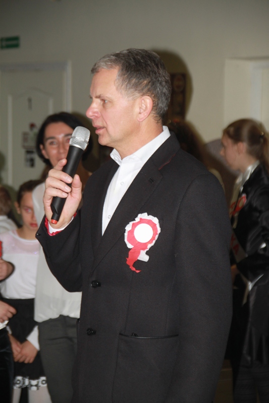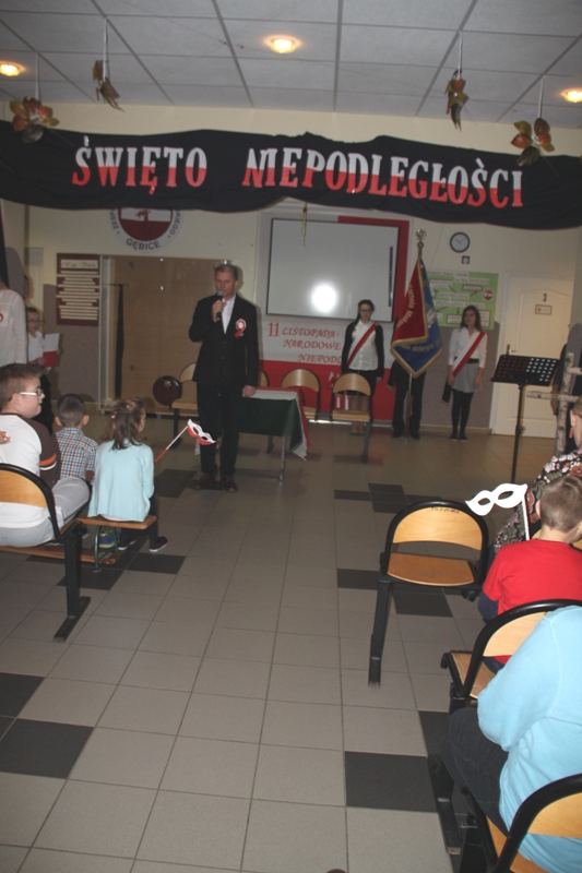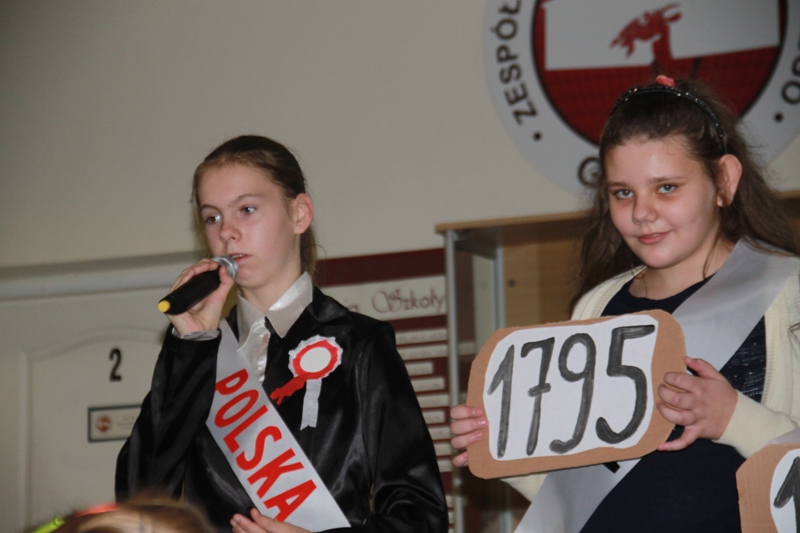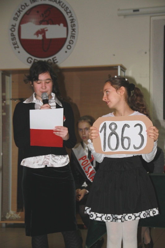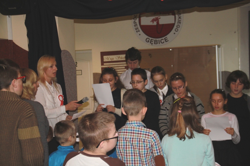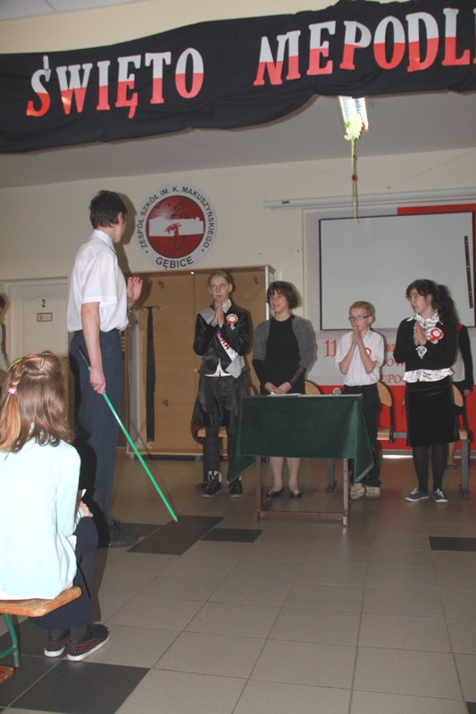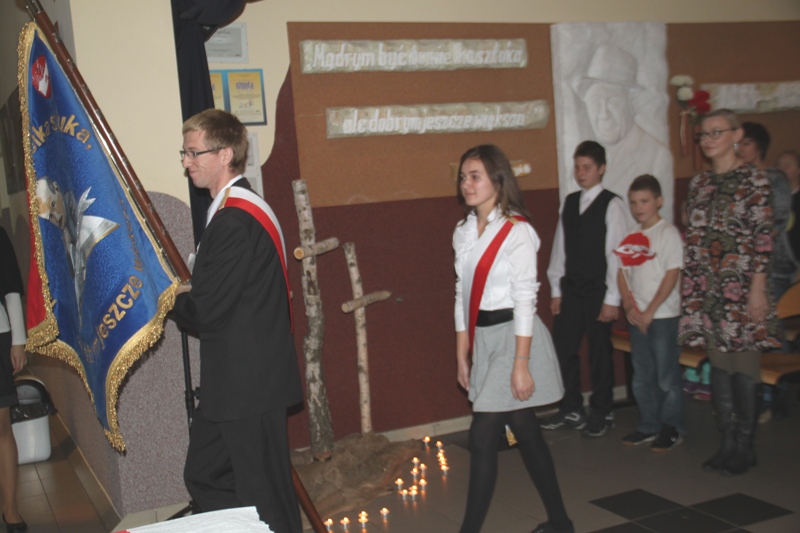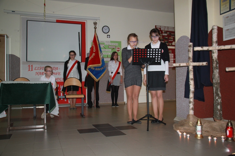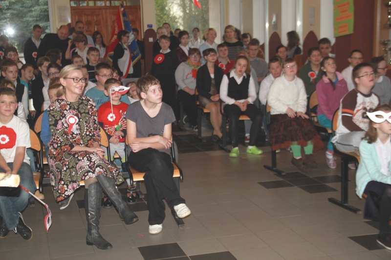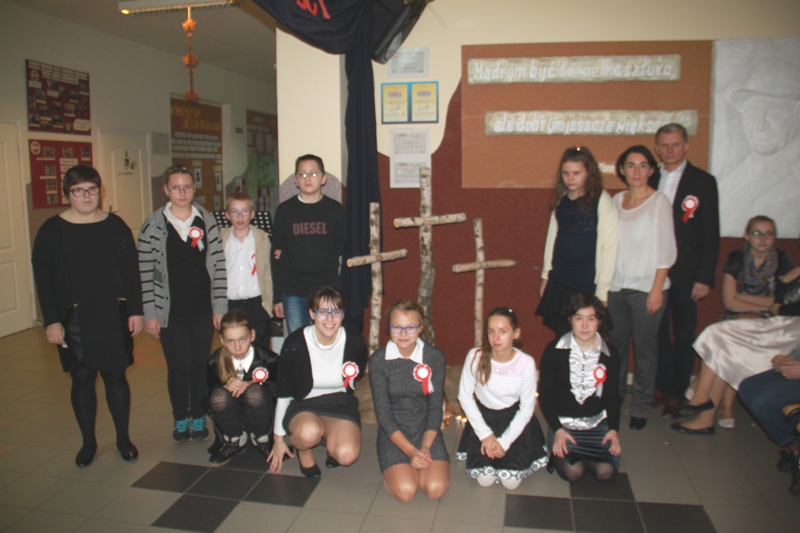 „Szary dzień listopada… Na wietrze powiewa flaga…” tak zabrzmiały pierwsze słowa jednego z narratorów, a krzyże w blasku zniczy, jako element okolicznościowej dekoracji, miały przypominać cierpienia Polaków w okresie zaborów. Scenka przedstawiająca nauczyciela, który wymachując kijem, zabraniał uczniom polskiej mowy, to jeden z przejawów represji stosowanych przez zaborców.