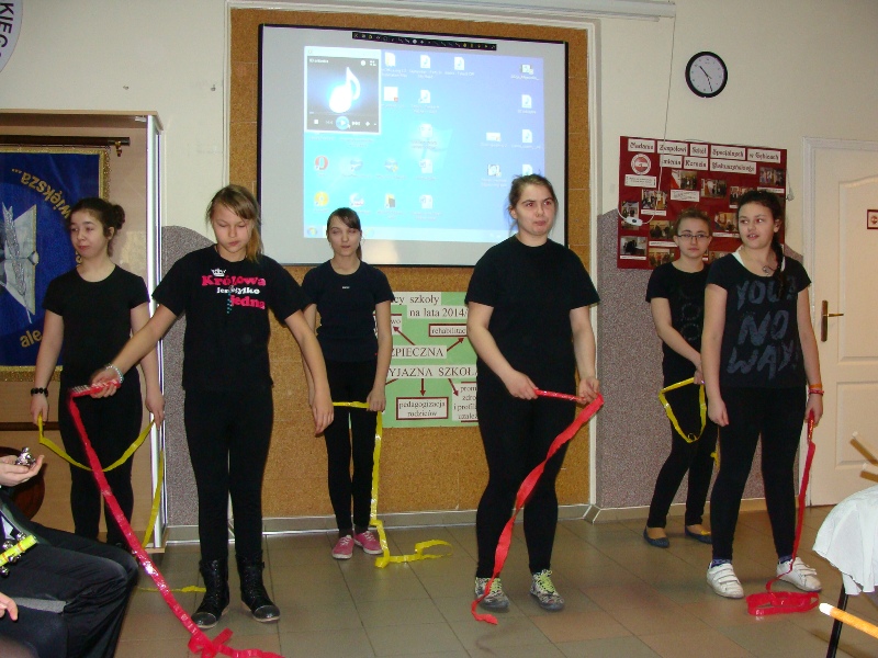 Dalsza część spotkania dotyczyła historii spódnic. Jedna z uczennic przedstawiła nam prezentację multimedialną na temat początków spódnicy oraz różnych jej fasonów. Następnie uczennice gimnazjum zaprezentowały się w spódnicach uszytych przez siebie na zajęciach technicznych. W spódnice ubrali się również chłopcy, którym nie zabrakło odwagi, żeby się pokazać na forum - zostali nagrodzeni brawami i słodkościami. Jednak spośród wielu kolorowych, o różnych fasonach i długościach, spódnic wybrano jedną, kwiecistą i długą, w którą ubrana była uczennica kl. Iż Adrianna Jyrgaś. Zwyciężczyni otrzymała dyplom z tytułem Super Spódnica i dużą czekoladę. Dyplom z tytułem Spódnica Roku i słodki upominek otrzymały także: pani Ewa Bals i uczennica kl. IIgż Róża Świerczyńska, które jako jedyne w szkole są wiernymi amatorkami tej części garderoby, ubierając ją codziennie. Wspólny taniec w kole w rytmie piosenki „a ty pokaż swoje nogi, nogi….” zakończył tę niecodzienną uroczystość.