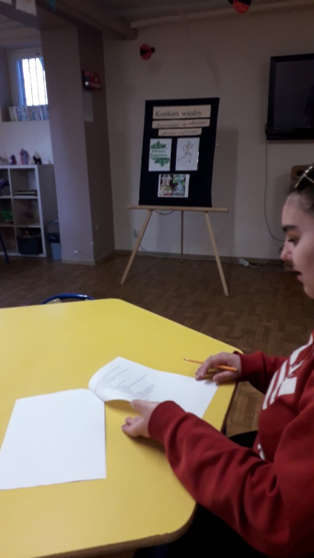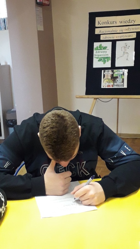 22 marca odbył się szkolny konkurs wiedzy o zdrowiu pt.” Racjonalnie się odżywiasz zdrowie wygrywasz”. Uczestniczyli w nim uczniowie kl. VII- VIII S oraz Szkoły Przysposabiającej do Pracy. Test składał się z 22 pytań. Zawierał zadania jednokrotnego wyboru a także pytania otwarte. Uczniowie musieli wiedzieć między innymi, co to są konserwanty żywności, jaka jest dopuszczalna ilość dziennego spożycia soli czy co to są probiotyki oraz wiele innych informacji na temat zdrowego odżywiania. I miejsce zajął Sebastian Piotrowski z kl. II SP , II miejsce Jakub Tetzlaff z kl. VIII S, a III miejsce przypadło Barbarze Śledź z klasy VII S. Laureatom serdecznie gratulujemy!!!