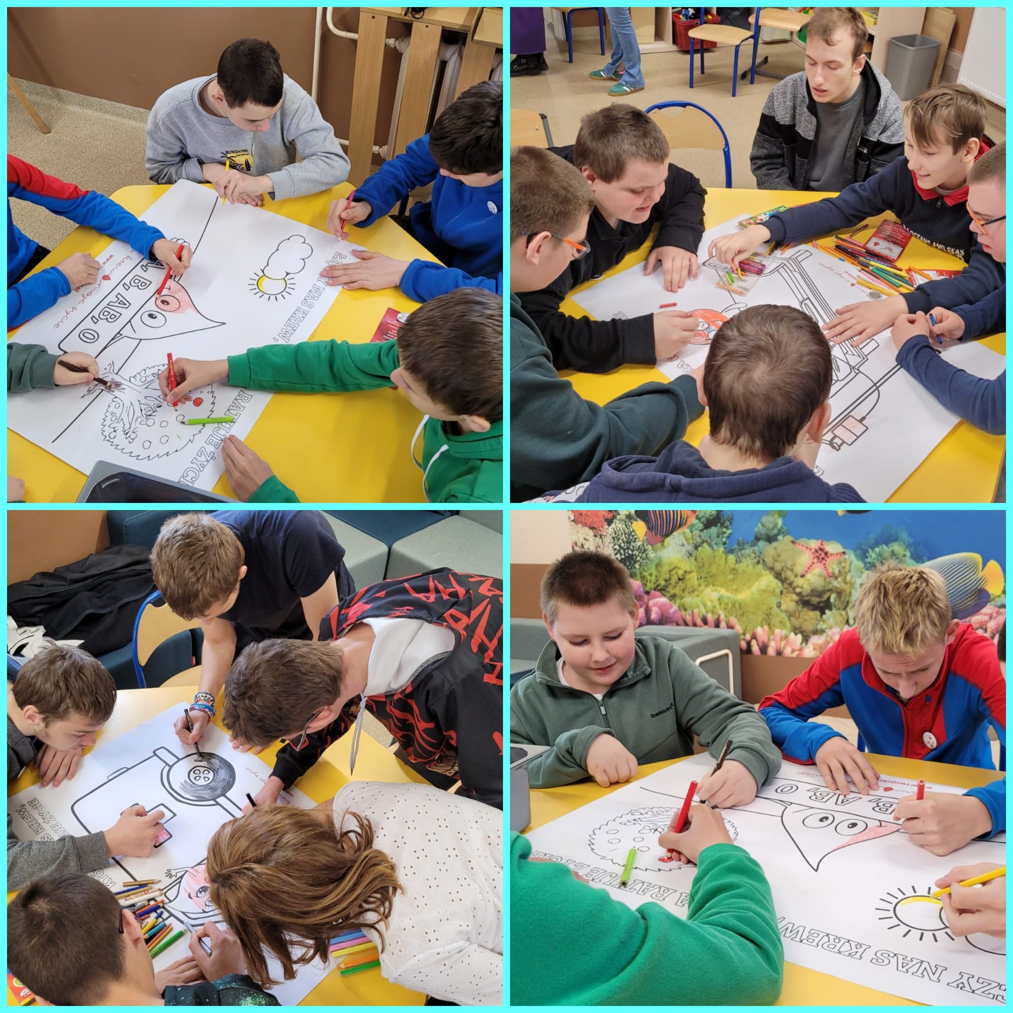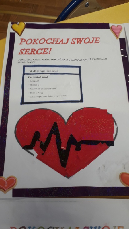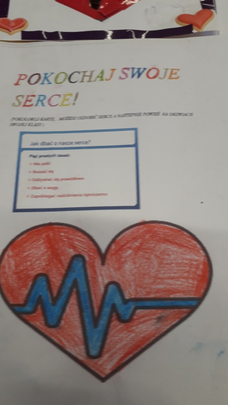 Pozostałe klasy posiadające kartę pracy „Pokochaj swoje serce”. Zapoznały się, że służą one do tego, że jesteśmy na miejscu i są one oznaczone przez własne dane oraz wykonanie zadania w widocznym miejscu.