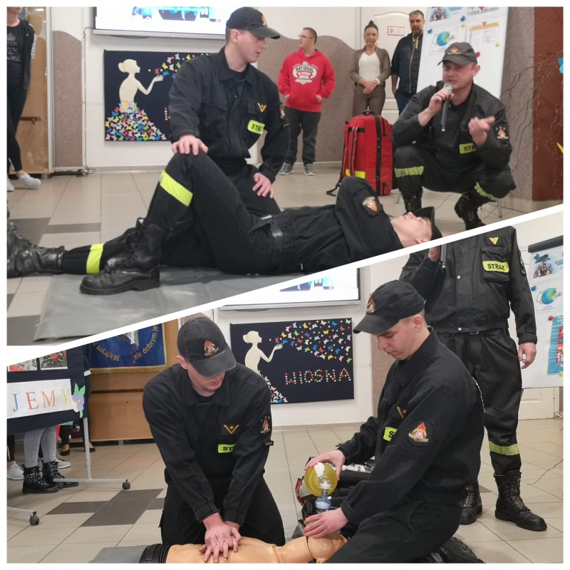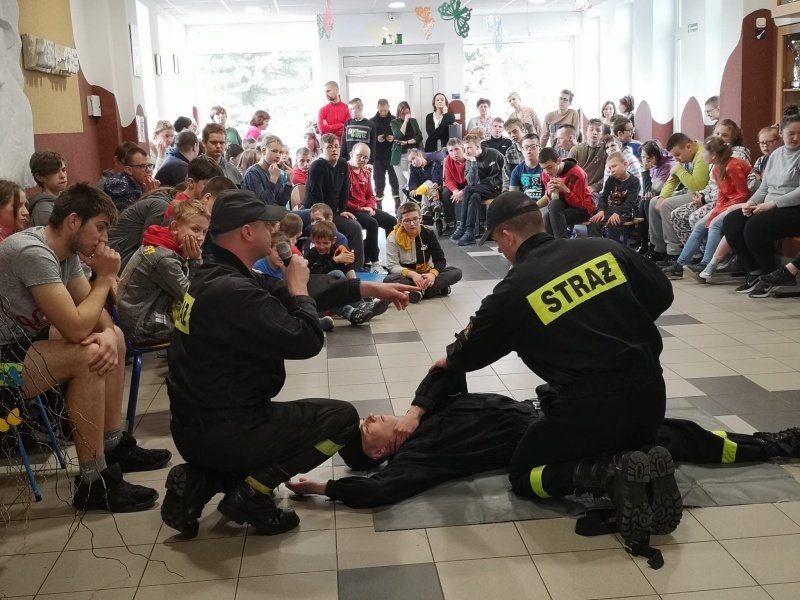 Najważniejszym punktem imprezy był przyjazd przedstawicieli Powiatowej Straży Pożarnej w Czarnkowie. Po raz kolejny uczniowie naszej szkoły, ćwiczyli wykonanie prawidłowej resuscytacji krążeniowo- oddechowej na fantomach osoby dorosłej i dziecka. Odbył się także pokaz wyposażenia wozu strażackiego i jego możliwości w różnych akcjach ratunkowych. Następnie wybrani uczniowie uczyli się opatrywania skaleczeń i tamowania krwotoków z wykorzystaniem profesjonalnego zestawu medycznego do imitacji ran. Poznawali etapy powstawania i rozpoznawania raka skóry.