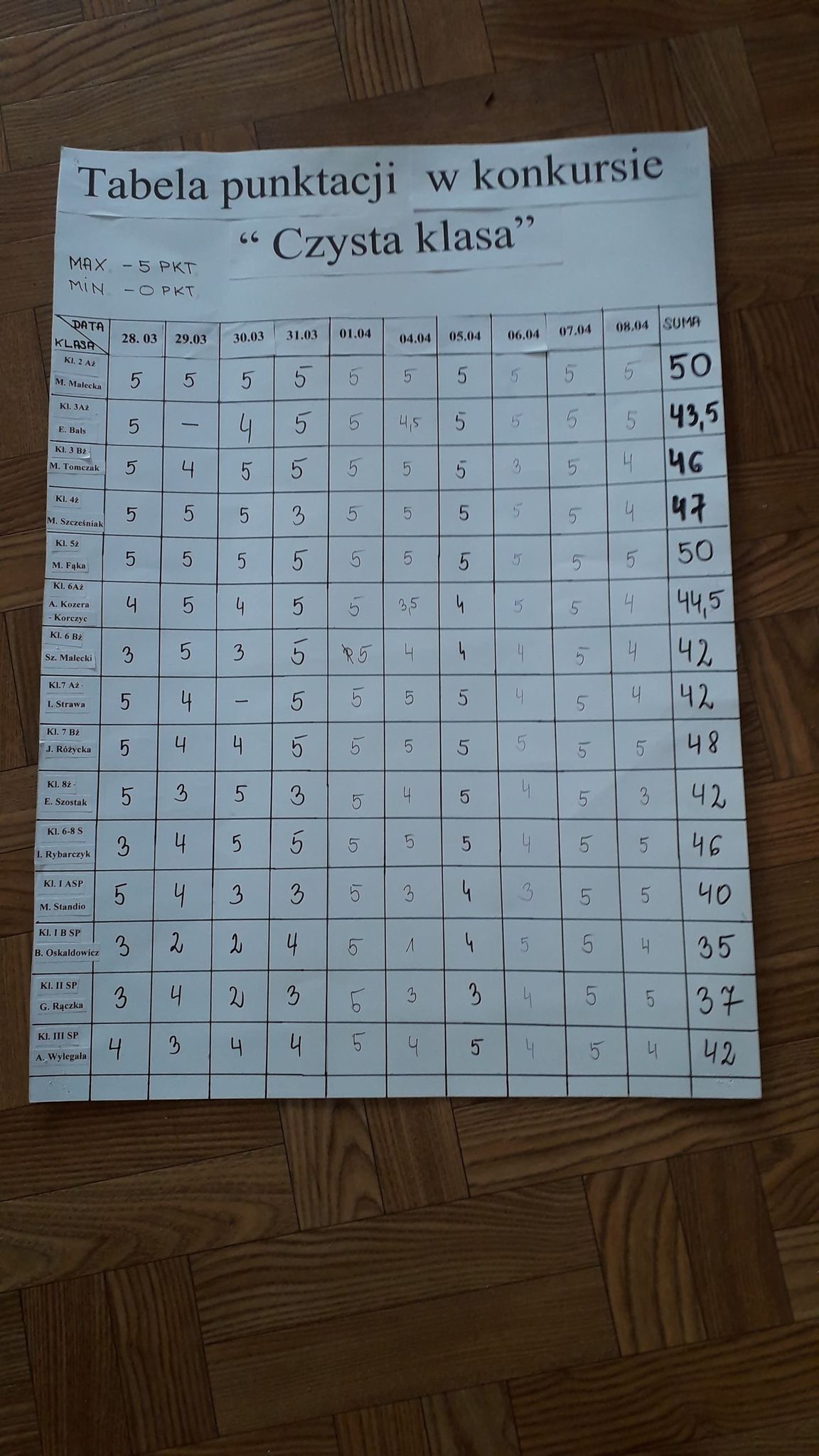 W dniach od 28.03 – 08.04. 2022r w ramach zaplanowanych działań Szkoły Promującej Zdrowie, odbył się szkolny konkurs na najczystszą klasę w szkole. Komisja konkursowa w różnych porach dnia, oceniała salę lekcyjną pod względem czystości i estetyki. Na specjalnej tablicy były wpisywane punkty od 0 – 5, otrzymane za czystość klasy. Uczniowie nie tylko z zapałem przeprowadzili w klasach gruntowne, wiosenne porządki, ale starali się na każdym kroku utrzymywać nienaganny porządek w swojej sali lekcyjnej. Duch rywalizacji i mobilizacji do działania był ogromny. Ogłoszenie wyników odbyło się na apelu z okazji Dnia Ziemi. Zwycięzcy otrzymali nagrody i pamiątkowe dyplomy.