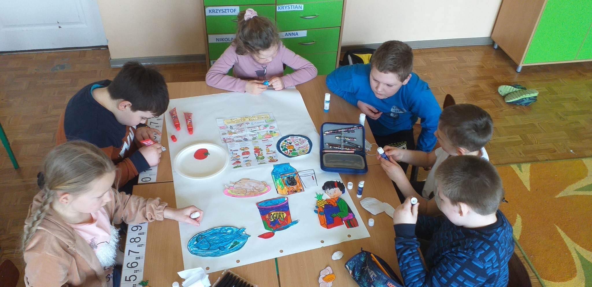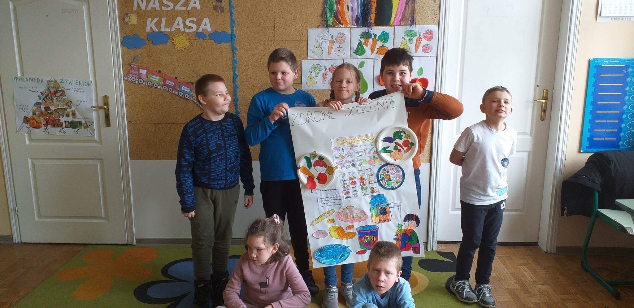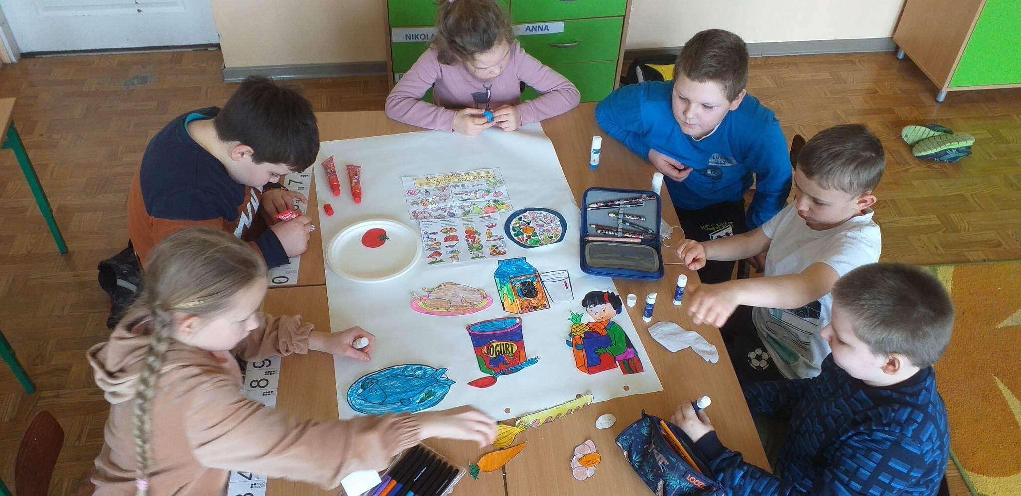 W czasie zajęć świetlicowych wspólnie wykonali gazetkę przedstawiająca Piramidę Żywności a klasa 2ż wykonała plakat: Zdrowe jedzenie.
