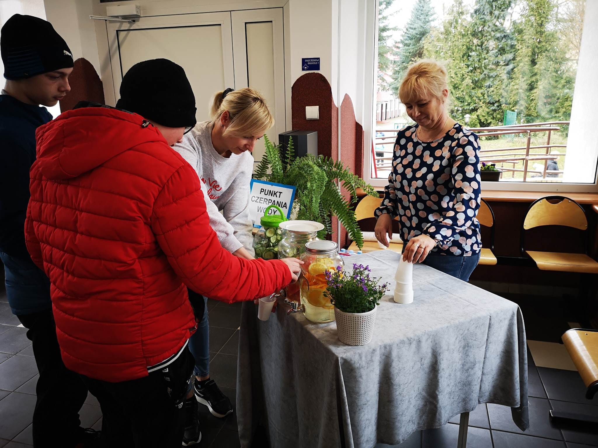 PUNKT CZERPANIA WODY ‐ w naszej kornelówce zorganizował zespół ds. Promocji Zdrowia, aby zachęcić całą społeczność szkolną do picia wody. Mieliśmy do wyboru wodę arbuzową, cytrusową i ogórkowo - pietruszkową oczywiście bez grama cukru. Wśród uczniów największym powodzeniem cieszyła się woda arbuzowa.