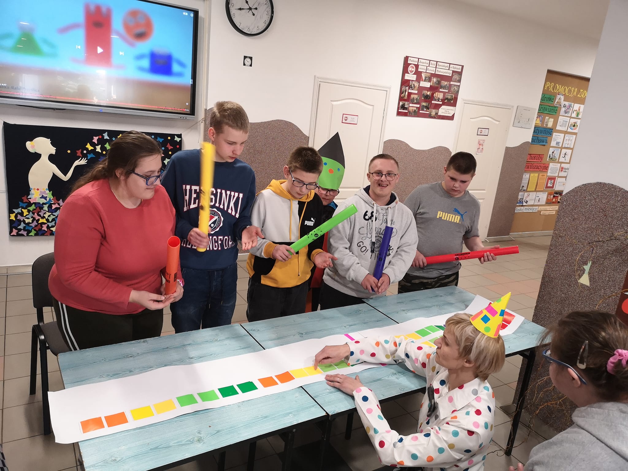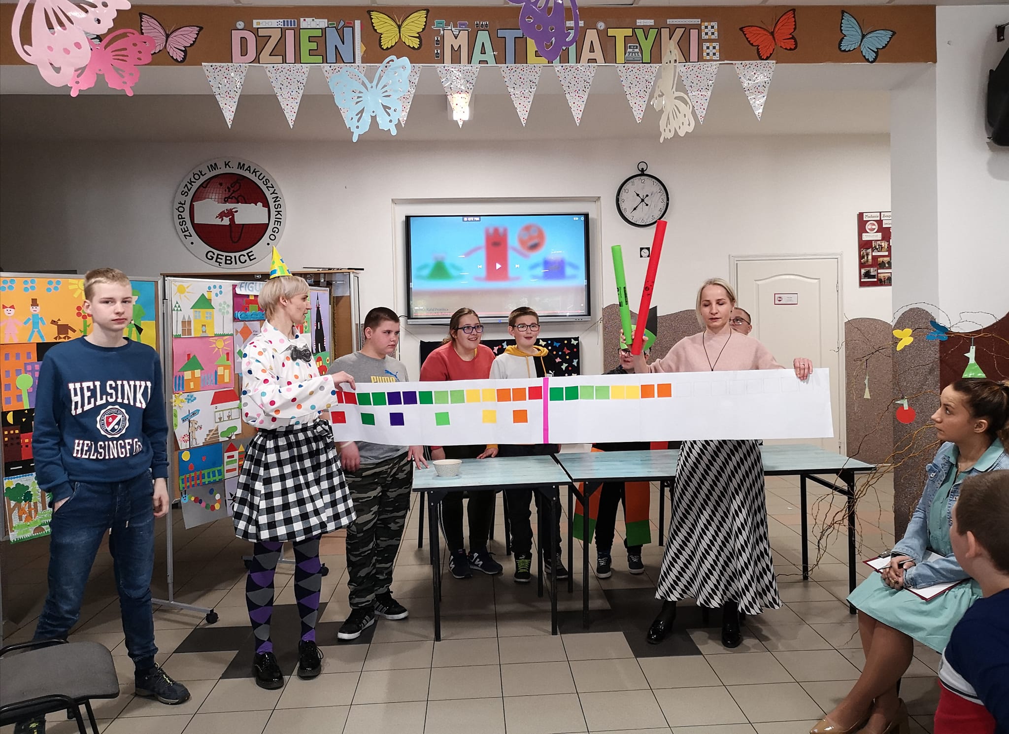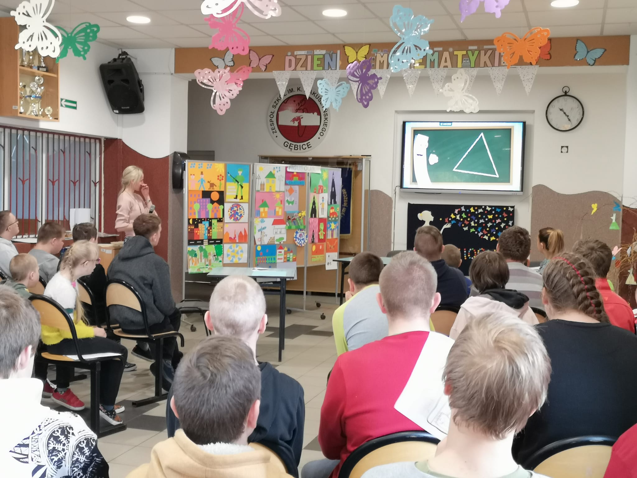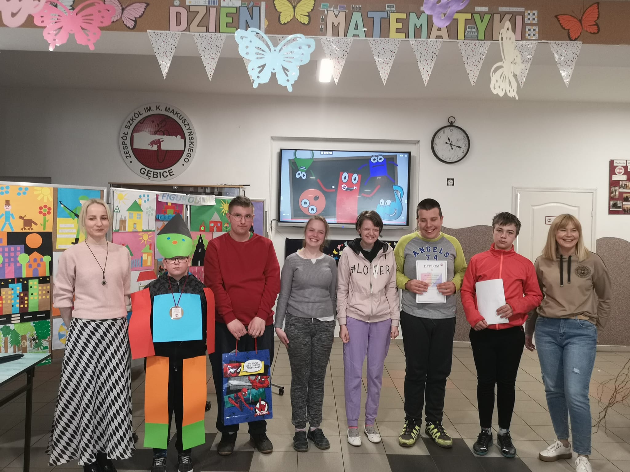 Dzień Matematyki w naszej szkole obchodziliśmy pod hasłem: "Matematyka jest wszędzie". W pierwszej części spotkania młodsi uczniowie przypomnieli sobie wiadomości na temat figur geometrycznych. Pani Ewa w bajkowy sposób przeniosła nas do krainy figur "Figurolandii" opowiadając historię Pajacyka. W drugiej części apelu przeprowadzono mini turniej matematyczny, w którym brali udział chętni uczniowie. Przygotowane zadania dotyczyły różnych dziedzin matematycznych. Jedna runda przeznaczona była także dla naszych nauczycieli. Zwycięzcy zostali nagrodzeni słodkim upominkiem i medalem.