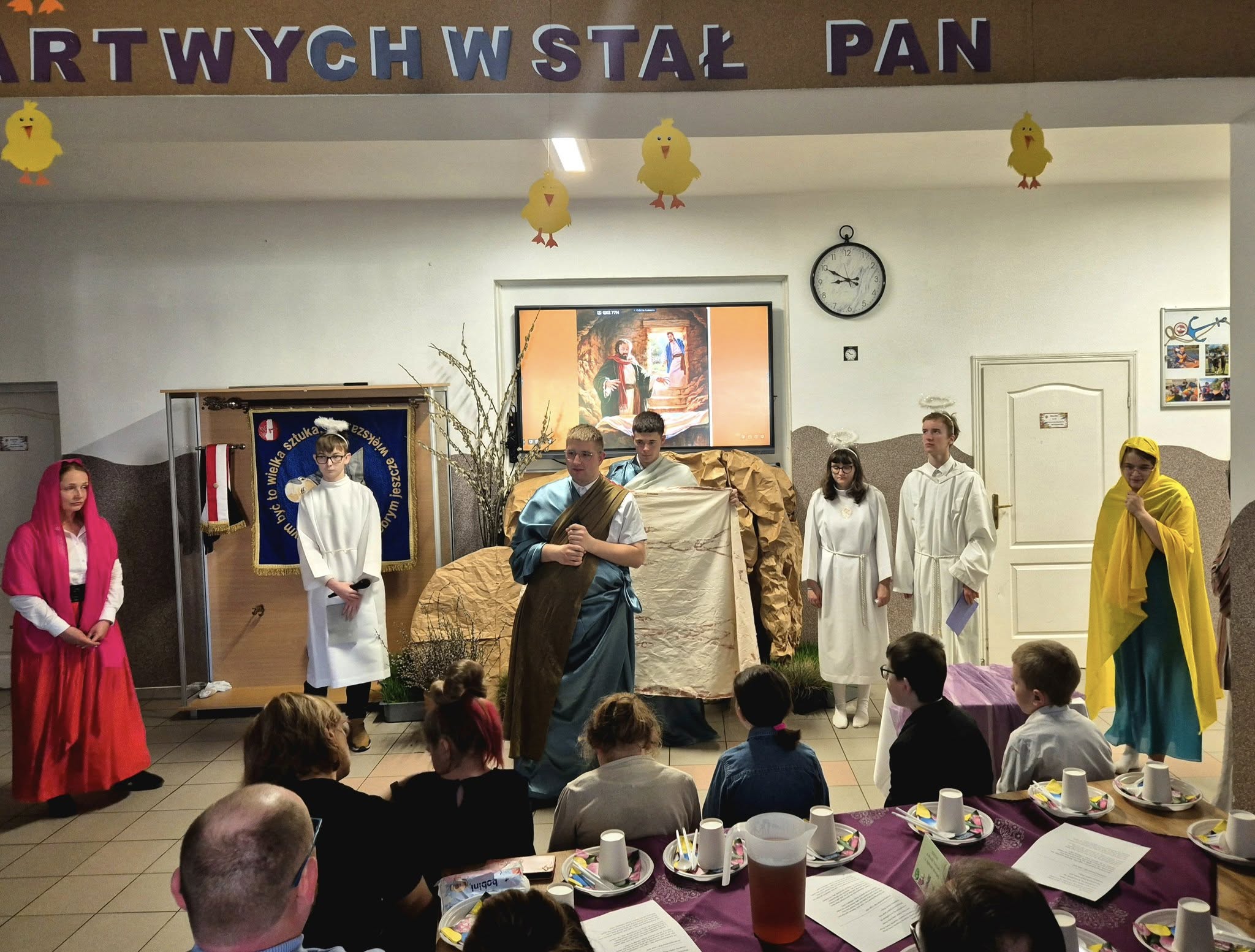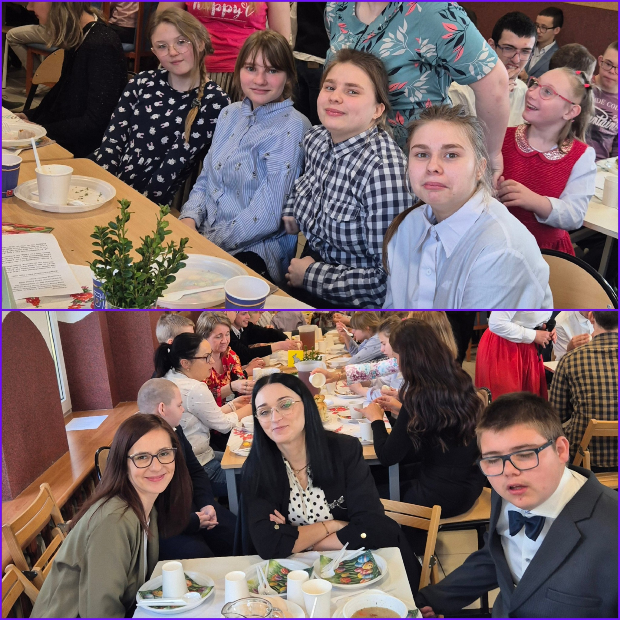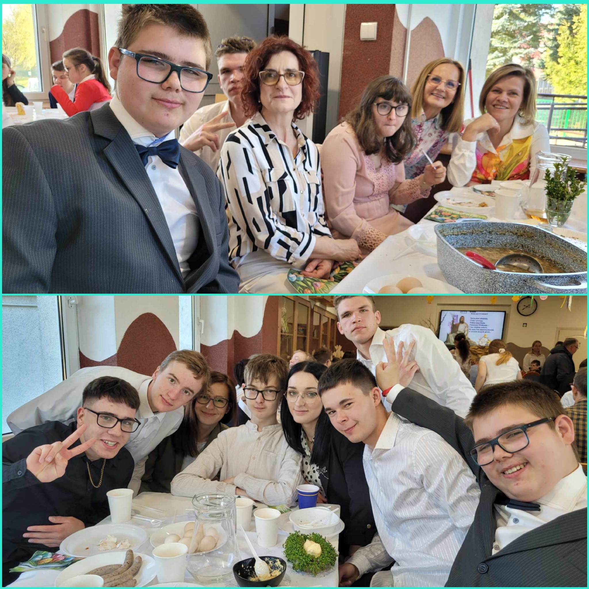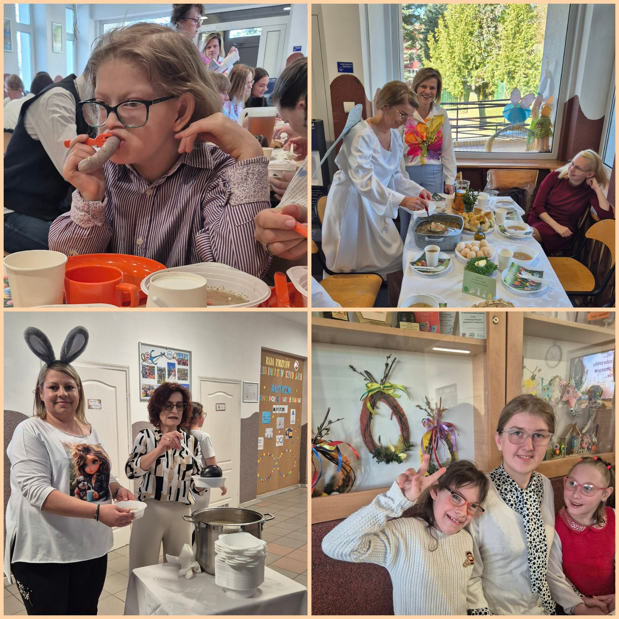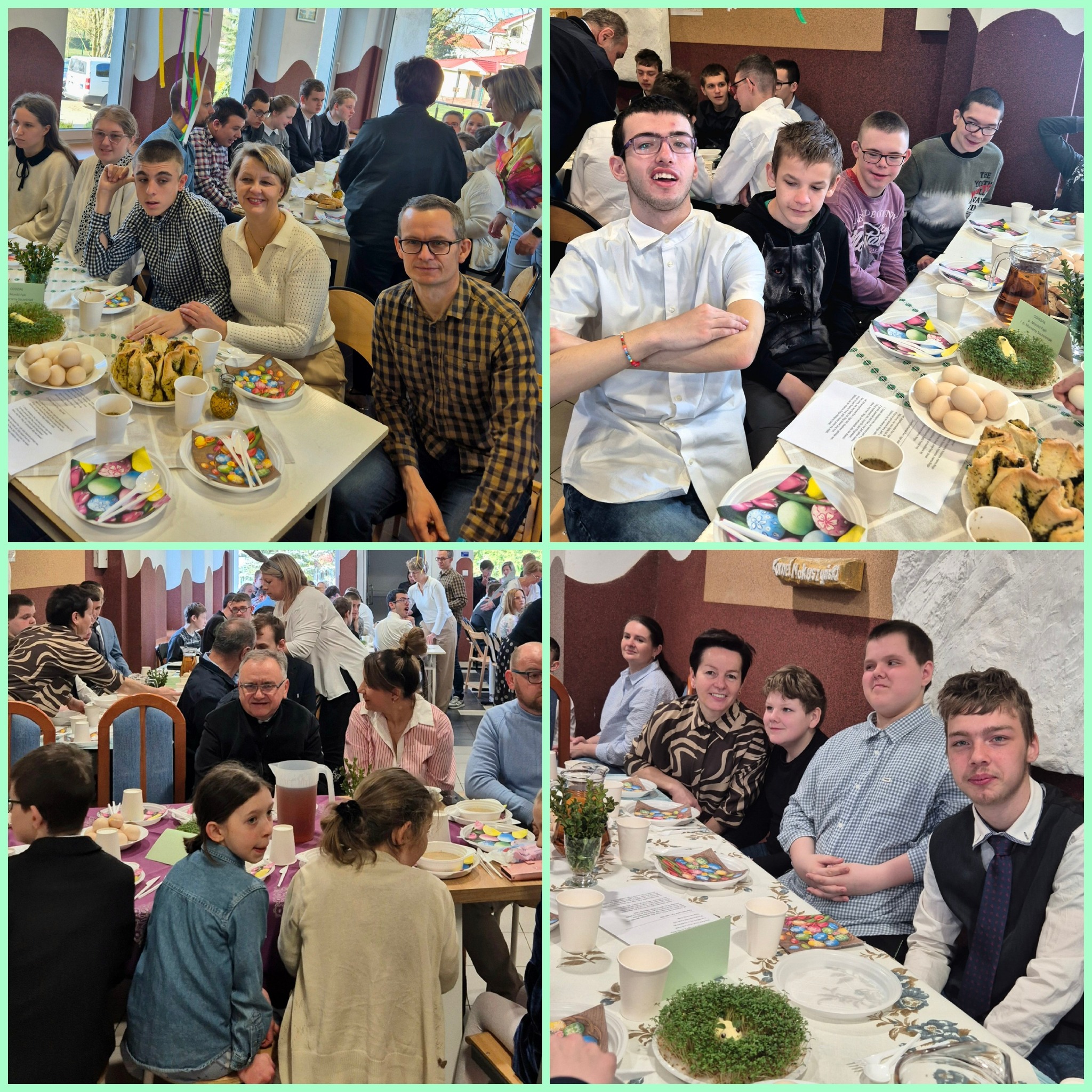 Mieliśmy okazję razem celebrować szkolne obchody świąt Wielkiej Nocy. Była to lekcja poświęcona wydarzeniu Zmartwychwstania Pańskiego, tradycji świątecznych pokarmów oraz ludowych obrzędów. Nasi uczniowie aktorsko zagrali wybrane sceny Ewangelii. Mieliśmy okazję skosztować żuru przygotowanego przez oddziały szkoły przysposabiającej do pracy, nie zabrakło również baranka, jaj, bab, chleba oraz białej kiełbaski. Ucztą dla naszych zmysłów był gościnny występ zespołu ludowego "LUBASZANKI", którego wykonawcy zaprezentowali pieśni religijne, ludowe i biesiadne przy wspaniałym akompaniamencie akordeonu. Całość zwieńczył quiz wiedzy podsumowujący to, co zapamiętaliśmy z dzisiejszego śniadania. Dziękujemy za obecność ks. proboszczowi Sławomirowi Wasieli, oraz Wszystkim, którzy zakupili kalendarze Kornelówka 2025 - dochód z ich sprzedaży sfinansował całe dzisiejsze przedsięwzięcie.