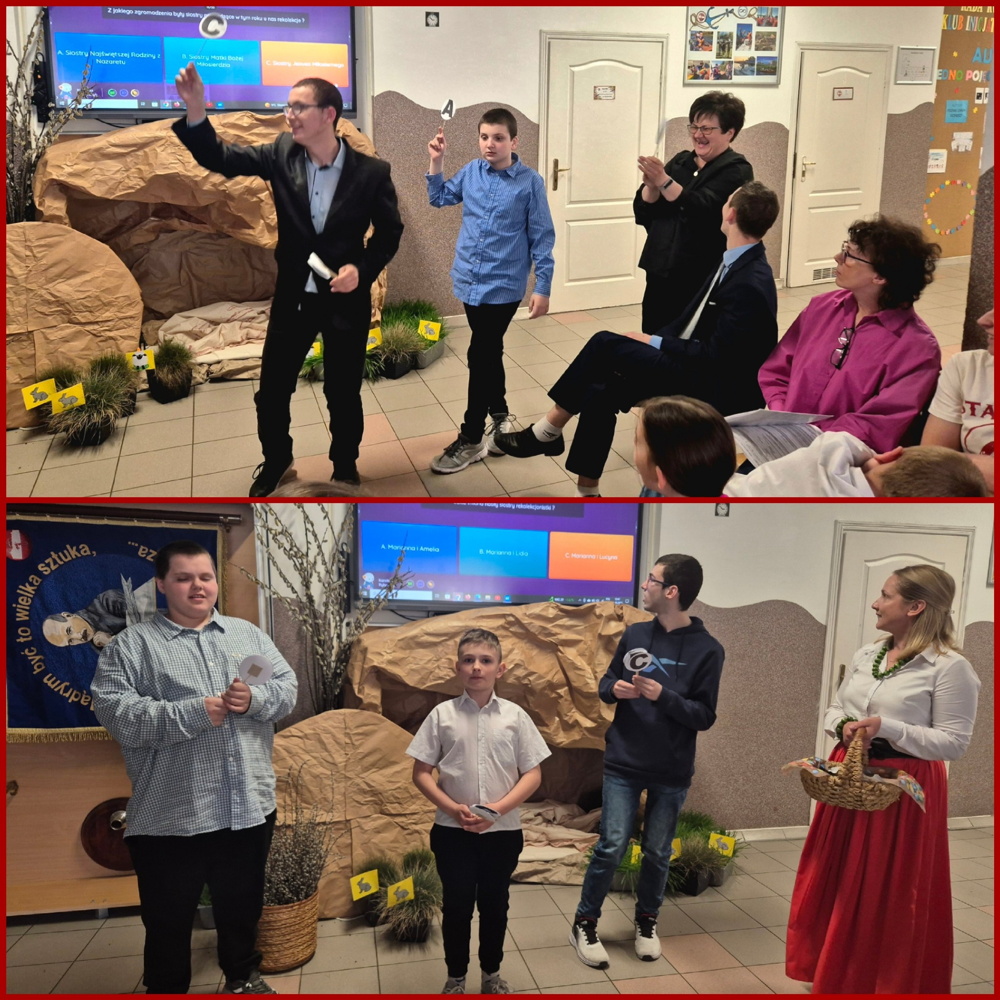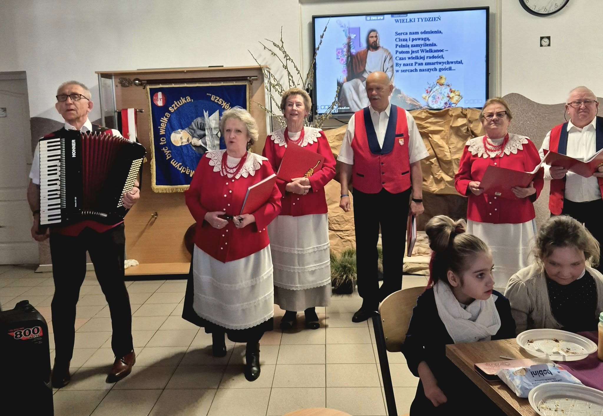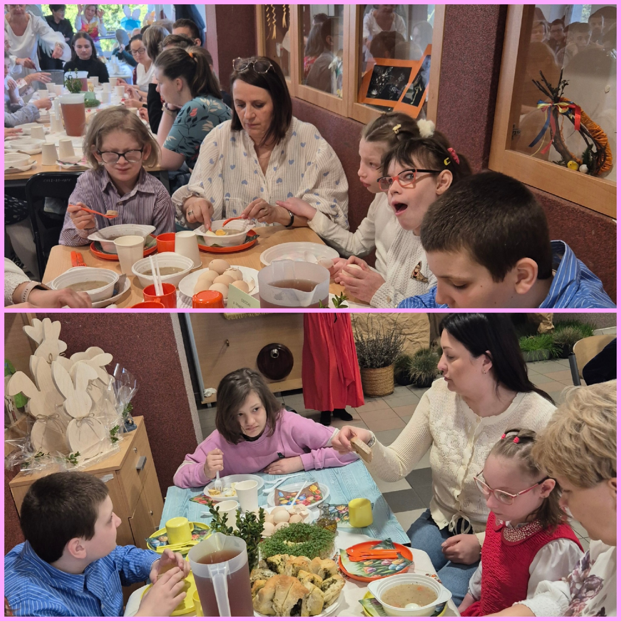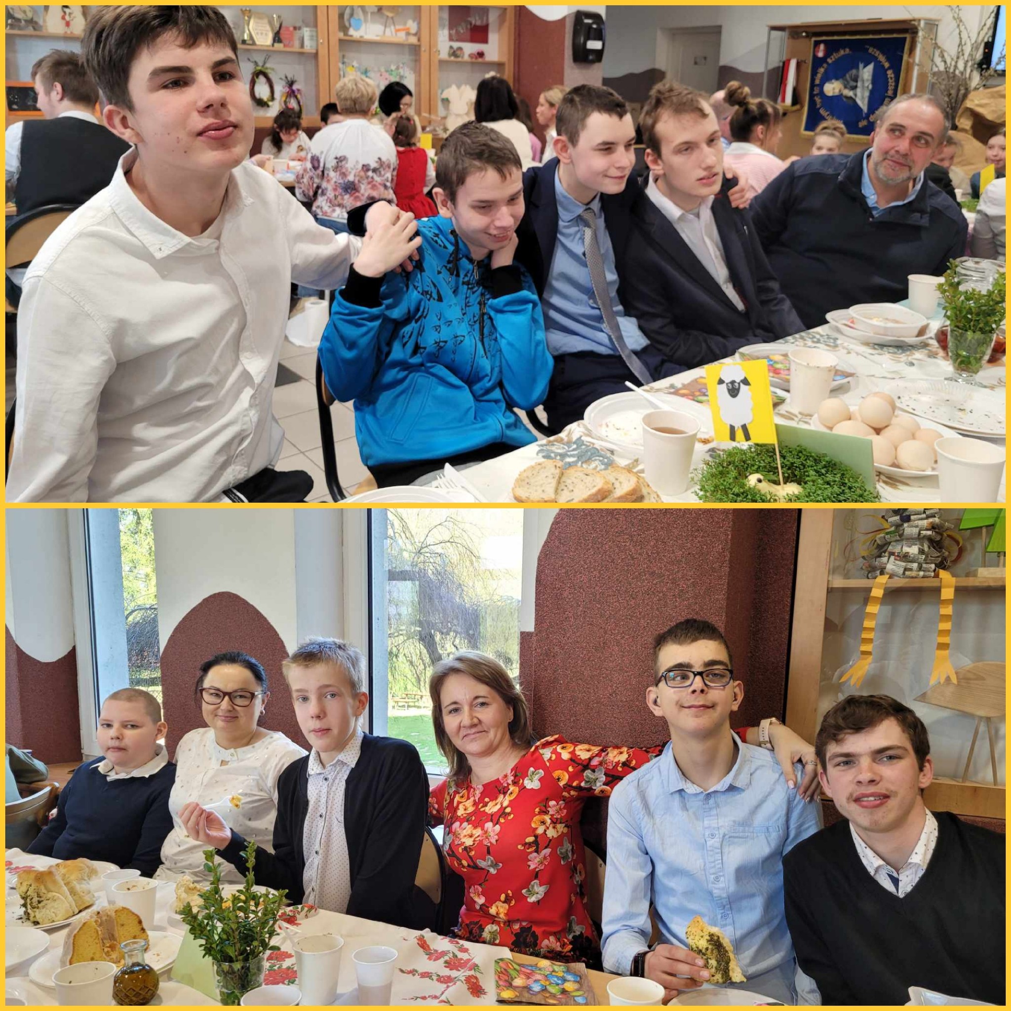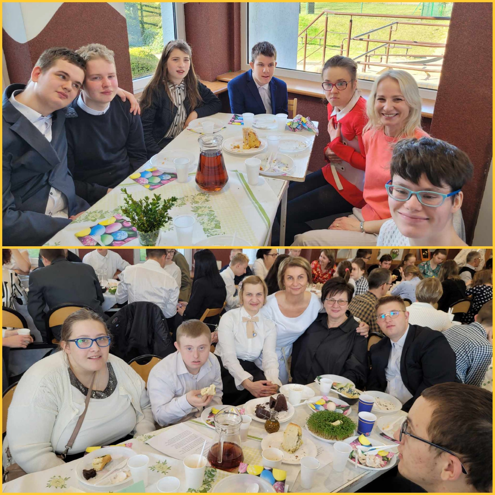 Mieliśmy okazję razem celebrować szkolne obchody świąt Wielkiej Nocy. Była to lekcja poświęcona wydarzeniu Zmartwychwstania Pańskiego, tradycji świątecznych pokarmów oraz ludowych obrzędów. Nasi uczniowie aktorsko zagrali wybrane sceny Ewangelii. Mieliśmy okazję skosztować żuru przygotowanego przez oddziały szkoły przysposabiającej do pracy, nie zabrakło również baranka, jaj, bab, chleba oraz białej kiełbaski. Ucztą dla naszych zmysłów był gościnny występ zespołu ludowego "LUBASZANKI", którego wykonawcy zaprezentowali pieśni religijne, ludowe i biesiadne przy wspaniałym akompaniamencie akordeonu. Całość zwieńczył quiz wiedzy podsumowujący to, co zapamiętaliśmy z dzisiejszego śniadania. Dziękujemy za obecność ks. proboszczowi Sławomirowi Wasieli, oraz Wszystkim, którzy zakupili kalendarze Kornelówka 2025 - dochód z ich sprzedaży sfinansował całe dzisiejsze przedsięwzięcie.