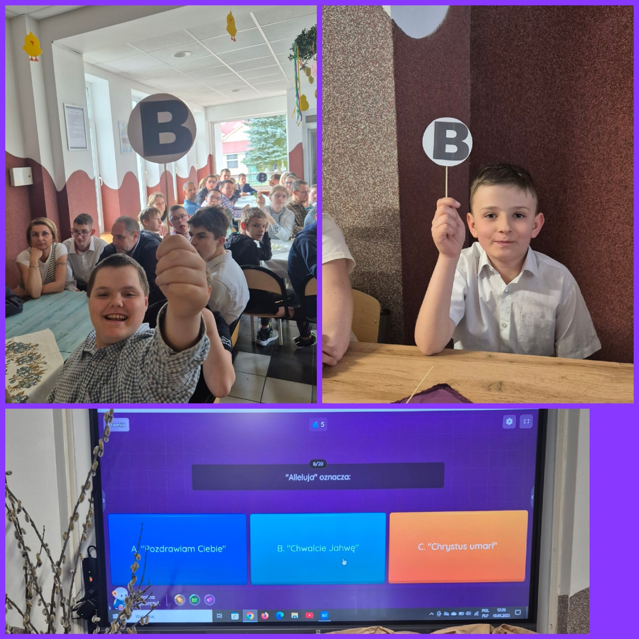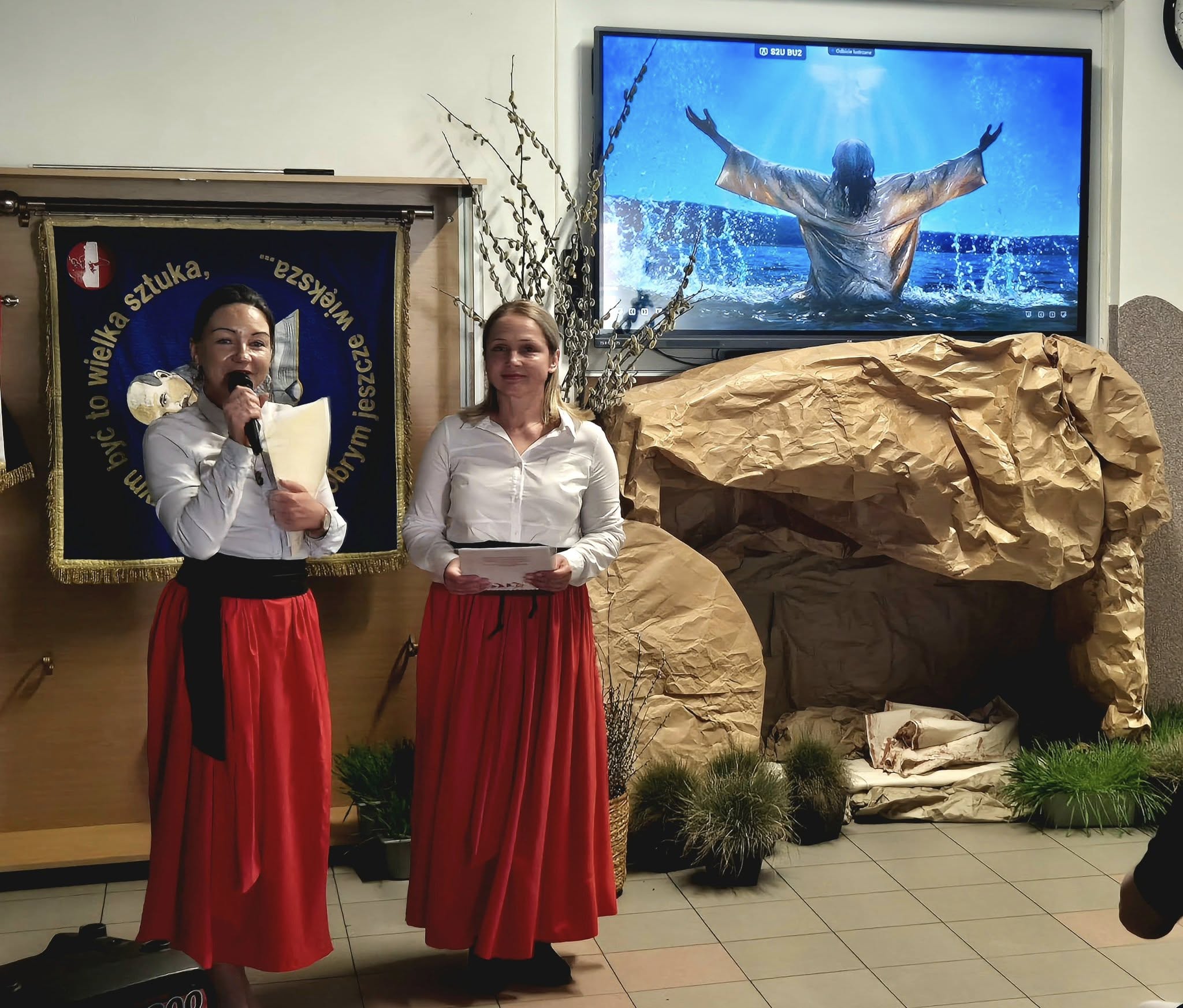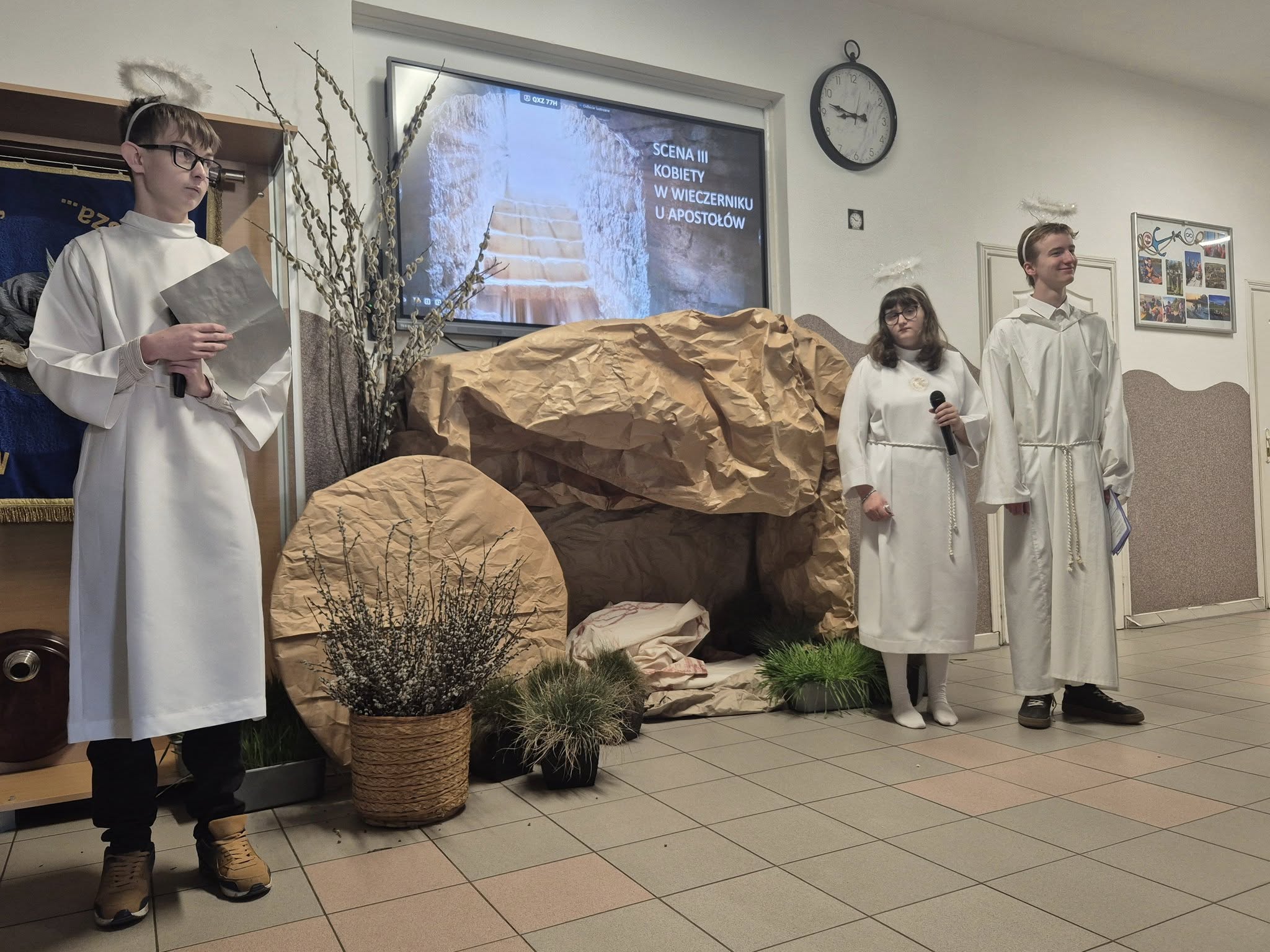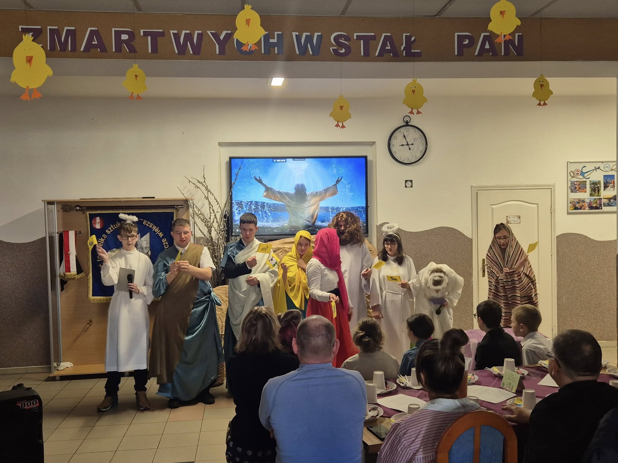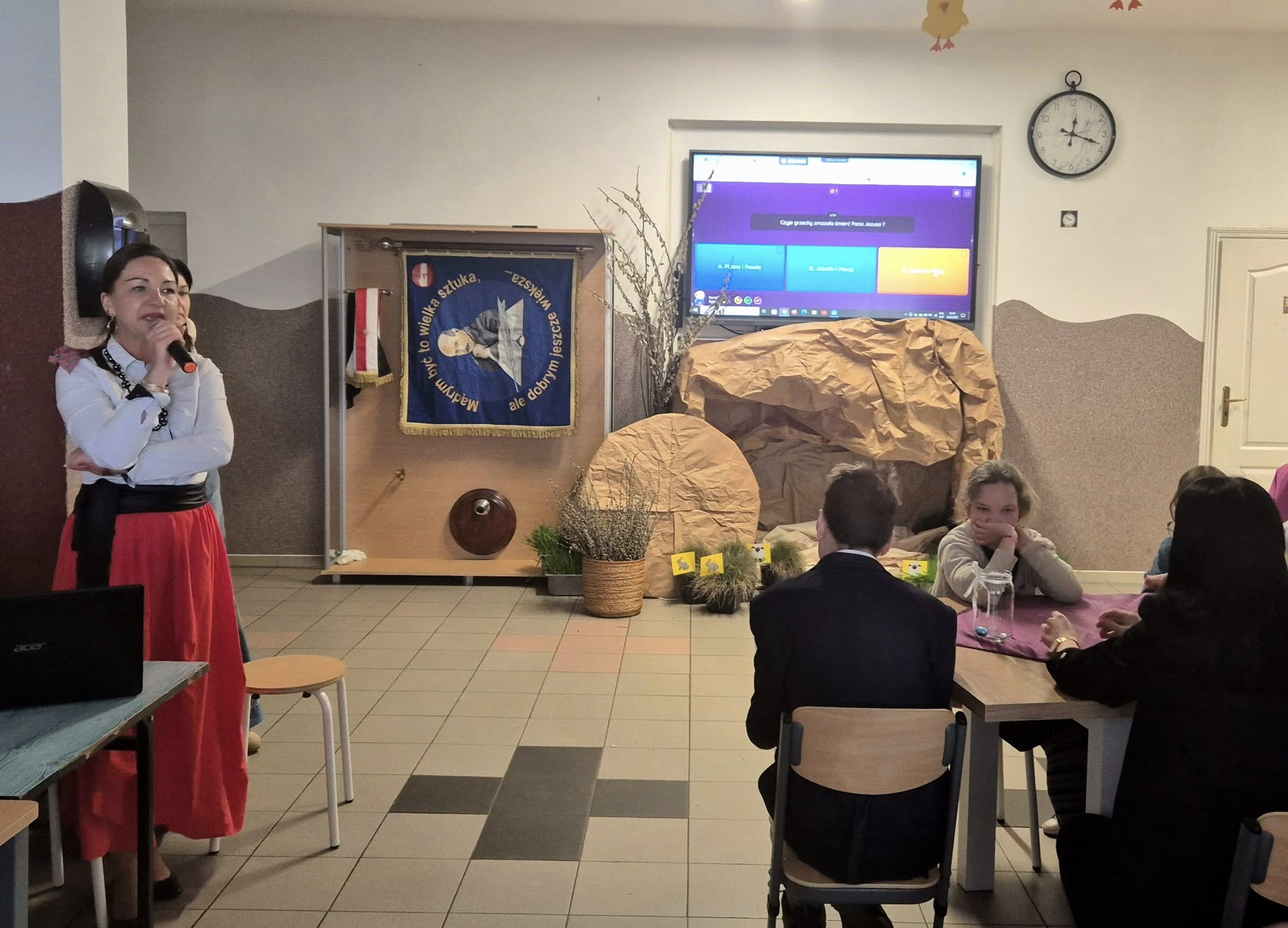 Mieliśmy okazję razem celebrować szkolne obchody świąt Wielkiej Nocy. Była to lekcja poświęcona wydarzeniu Zmartwychwstania Pańskiego, tradycji świątecznych pokarmów oraz ludowych obrzędów. Nasi uczniowie aktorsko zagrali wybrane sceny Ewangelii. Mieliśmy okazję skosztować żuru przygotowanego przez oddziały szkoły przysposabiającej do pracy, nie zabrakło również baranka, jaj, bab, chleba oraz białej kiełbaski. Ucztą dla naszych zmysłów był gościnny występ zespołu ludowego "LUBASZANKI", którego wykonawcy zaprezentowali pieśni religijne, ludowe i biesiadne przy wspaniałym akompaniamencie akordeonu. Całość zwieńczył quiz wiedzy podsumowujący to, co zapamiętaliśmy z dzisiejszego śniadania. Dziękujemy za obecność ks. proboszczowi Sławomirowi Wasieli, oraz Wszystkim, którzy zakupili kalendarze Kornelówka 2025 - dochód z ich sprzedaży sfinansował całe dzisiejsze przedsięwzięcie.