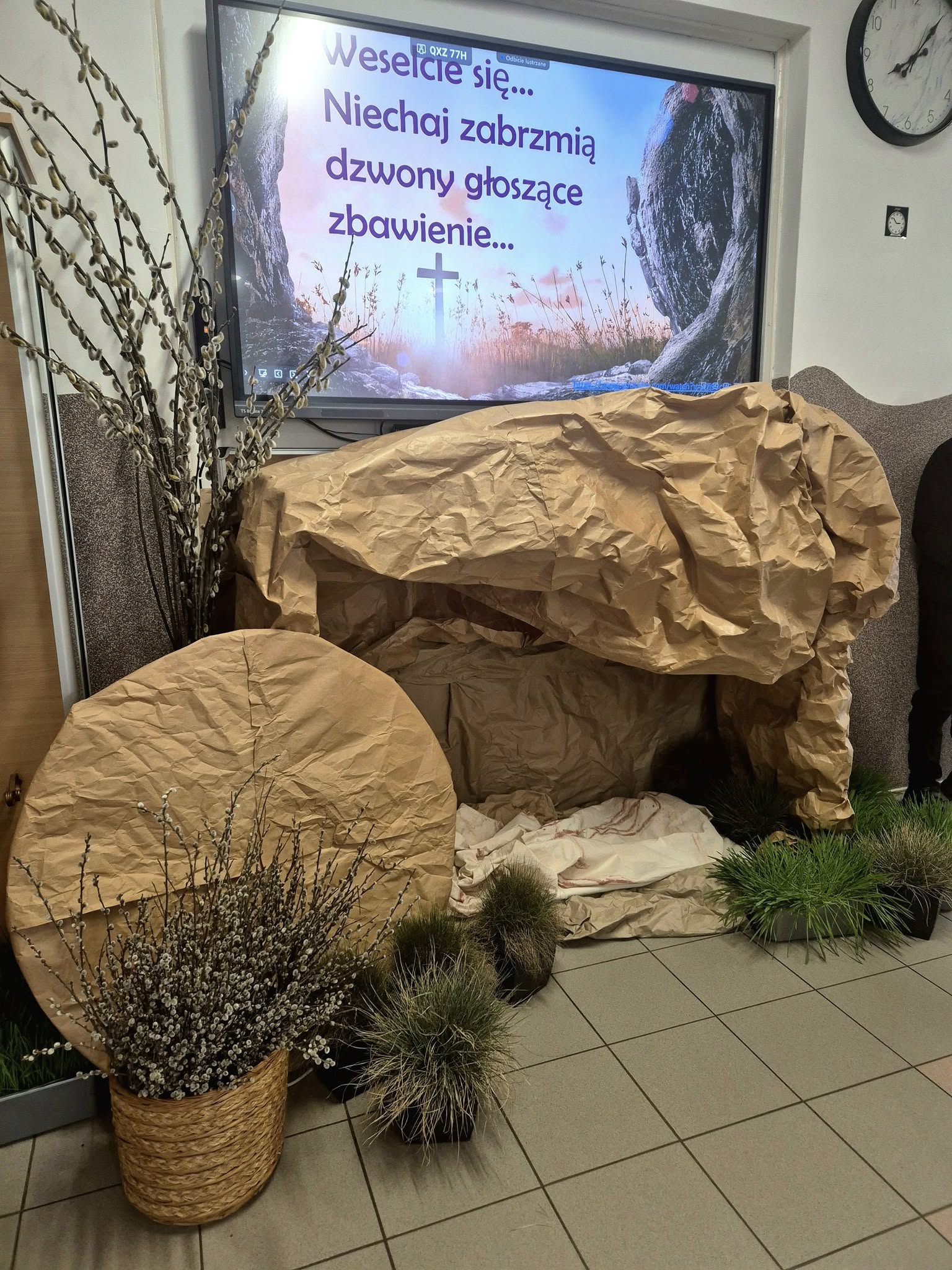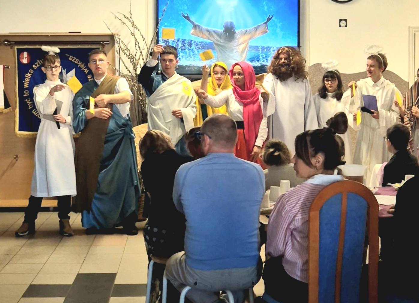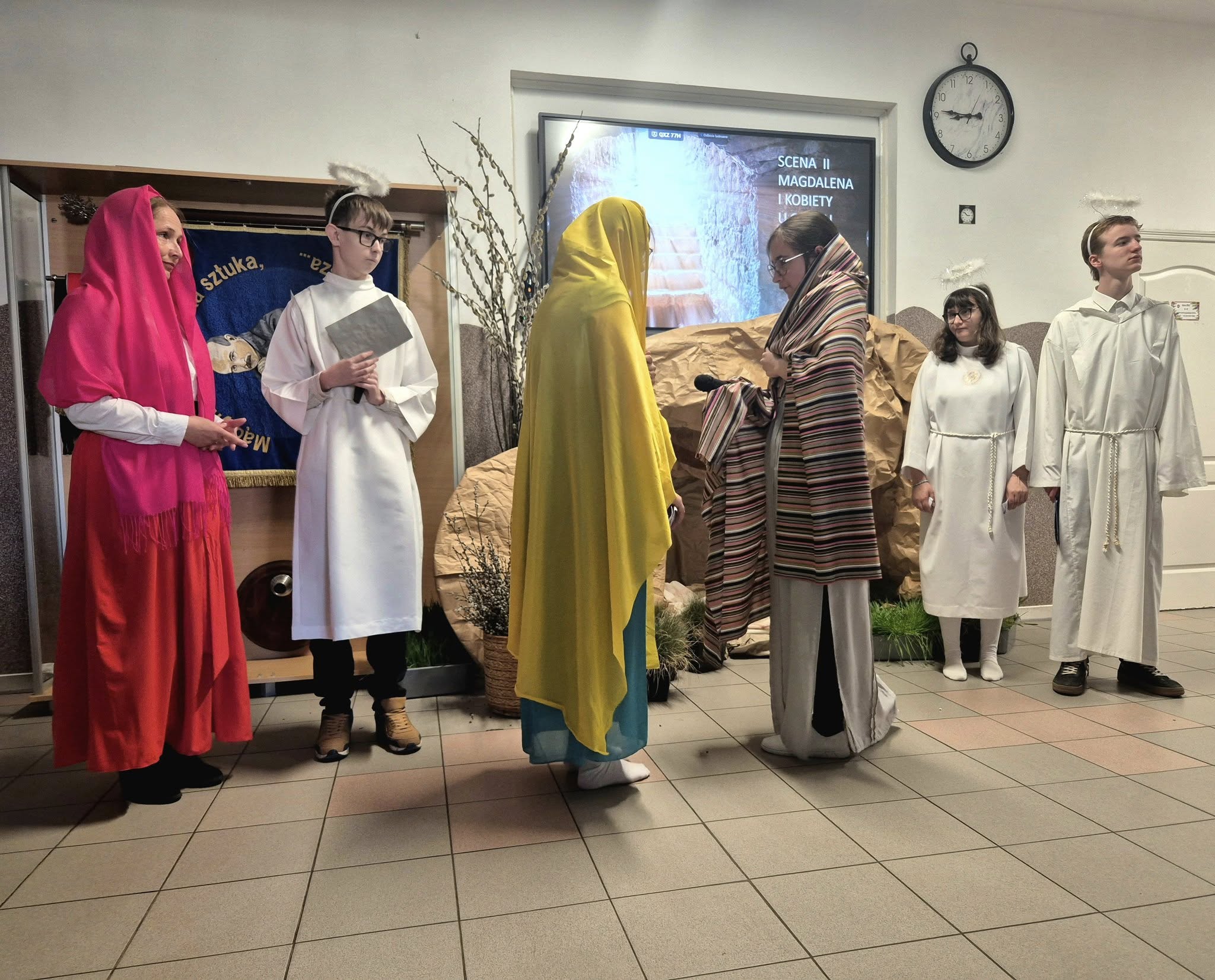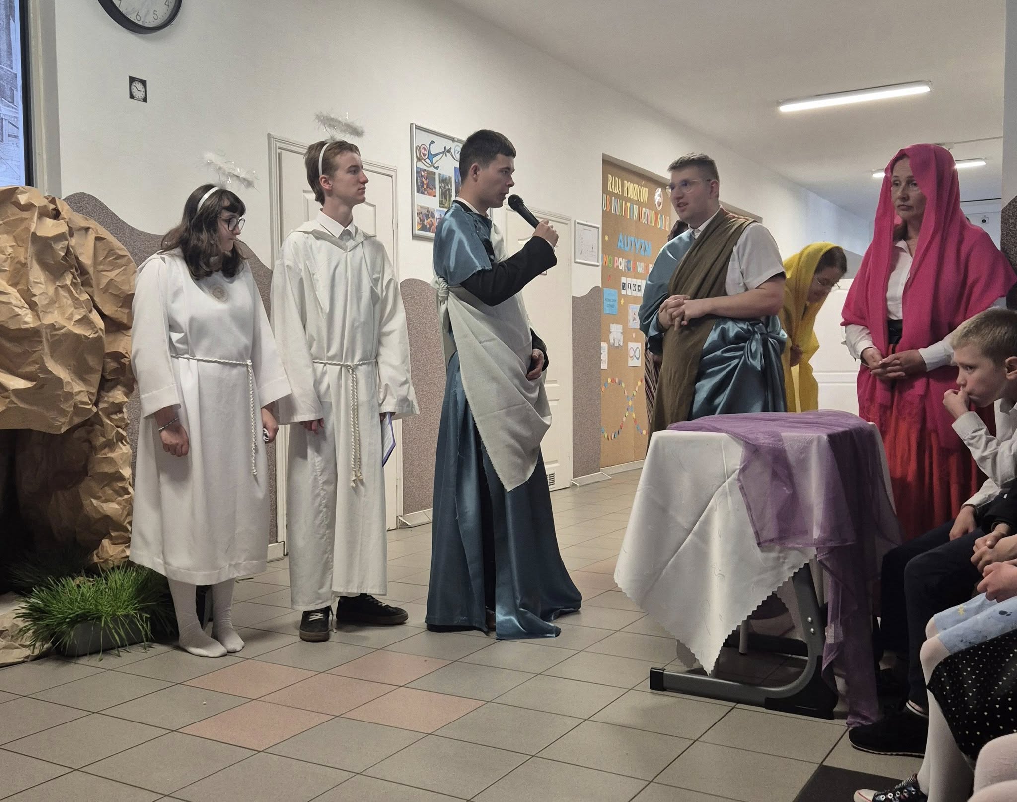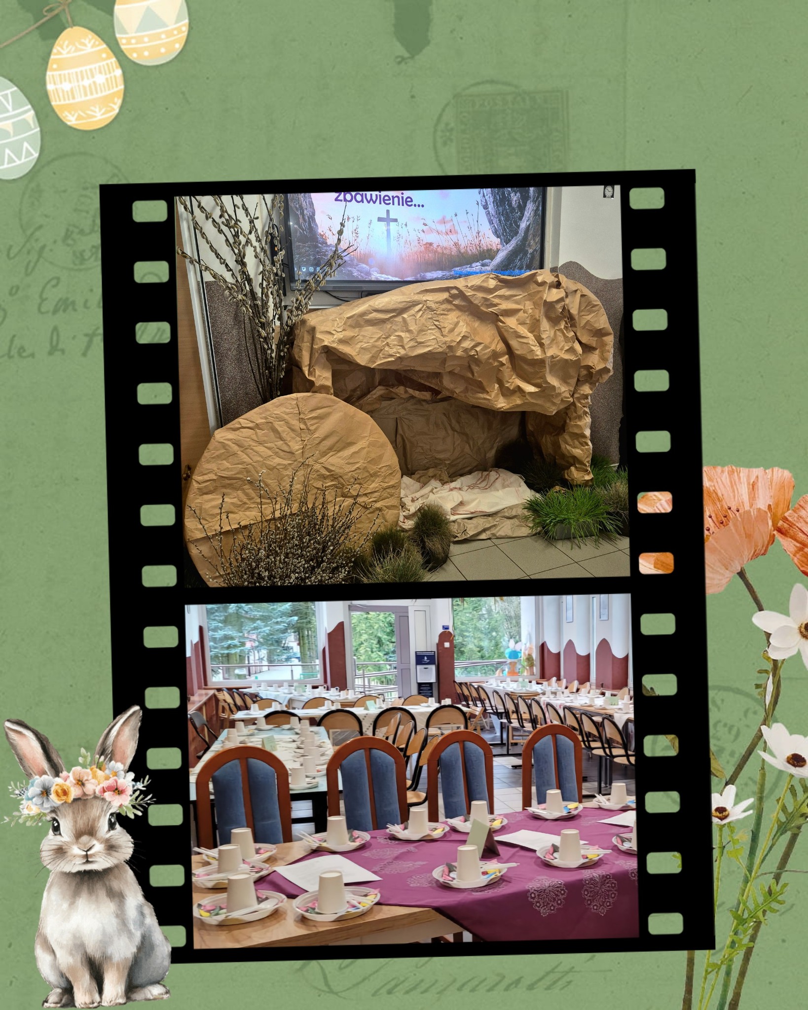 Mieliśmy okazję razem celebrować szkolne obchody świąt Wielkiej Nocy. Była to lekcja poświęcona wydarzeniu Zmartwychwstania Pańskiego, tradycji świątecznych pokarmów oraz ludowych obrzędów. Nasi uczniowie aktorsko zagrali wybrane sceny Ewangelii. Mieliśmy okazję skosztować żuru przygotowanego przez oddziały szkoły przysposabiającej do pracy, nie zabrakło również baranka, jaj, bab, chleba oraz białej kiełbaski. Ucztą dla naszych zmysłów był gościnny występ zespołu ludowego "LUBASZANKI", którego wykonawcy zaprezentowali pieśni religijne, ludowe i biesiadne przy wspaniałym akompaniamencie akordeonu. Całość zwieńczył quiz wiedzy podsumowujący to, co zapamiętaliśmy z dzisiejszego śniadania. Dziękujemy za obecność ks. proboszczowi Sławomirowi Wasieli, oraz Wszystkim, którzy zakupili kalendarze Kornelówka 2025 - dochód z ich sprzedaży sfinansował całe dzisiejsze przedsięwzięcie.