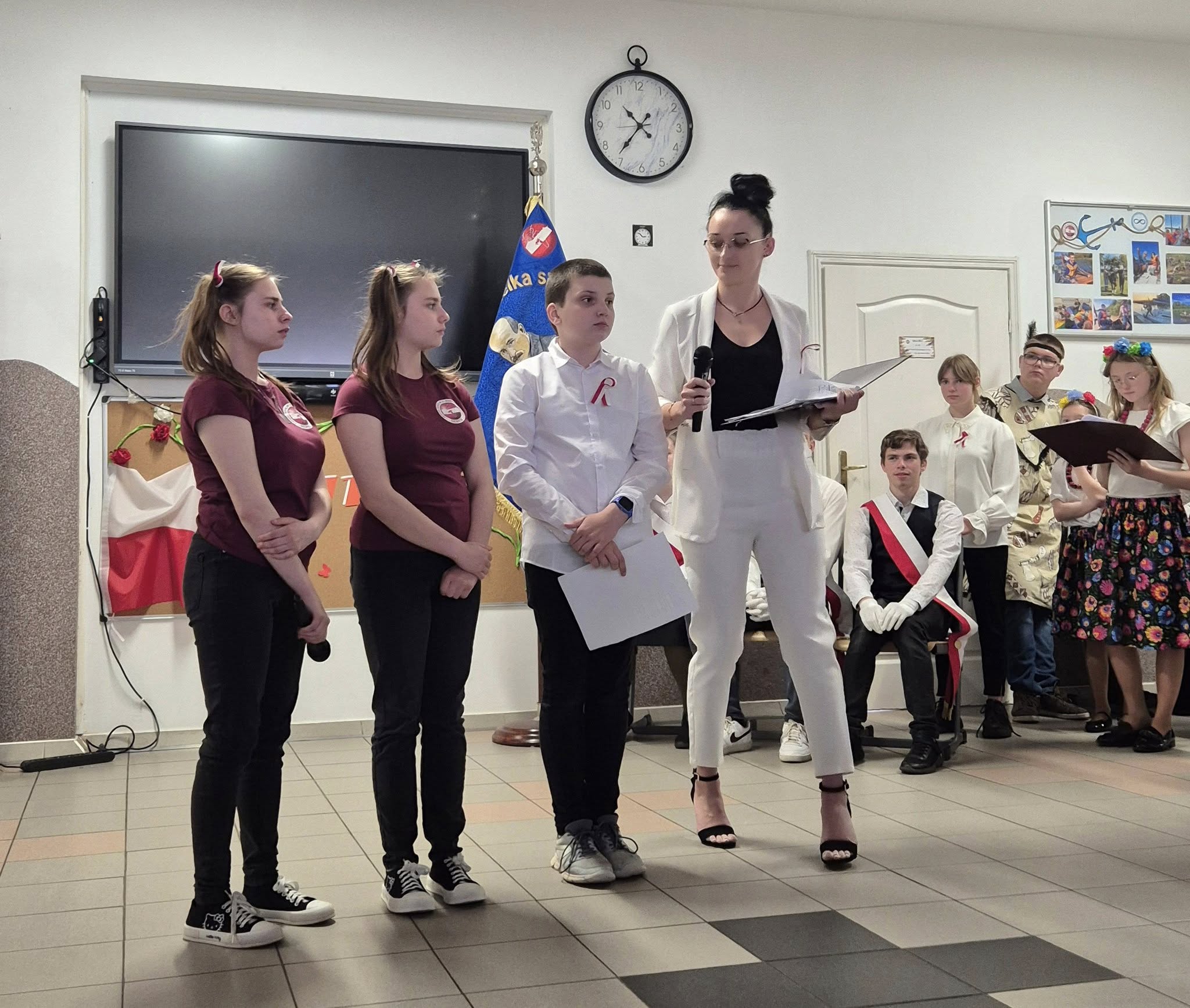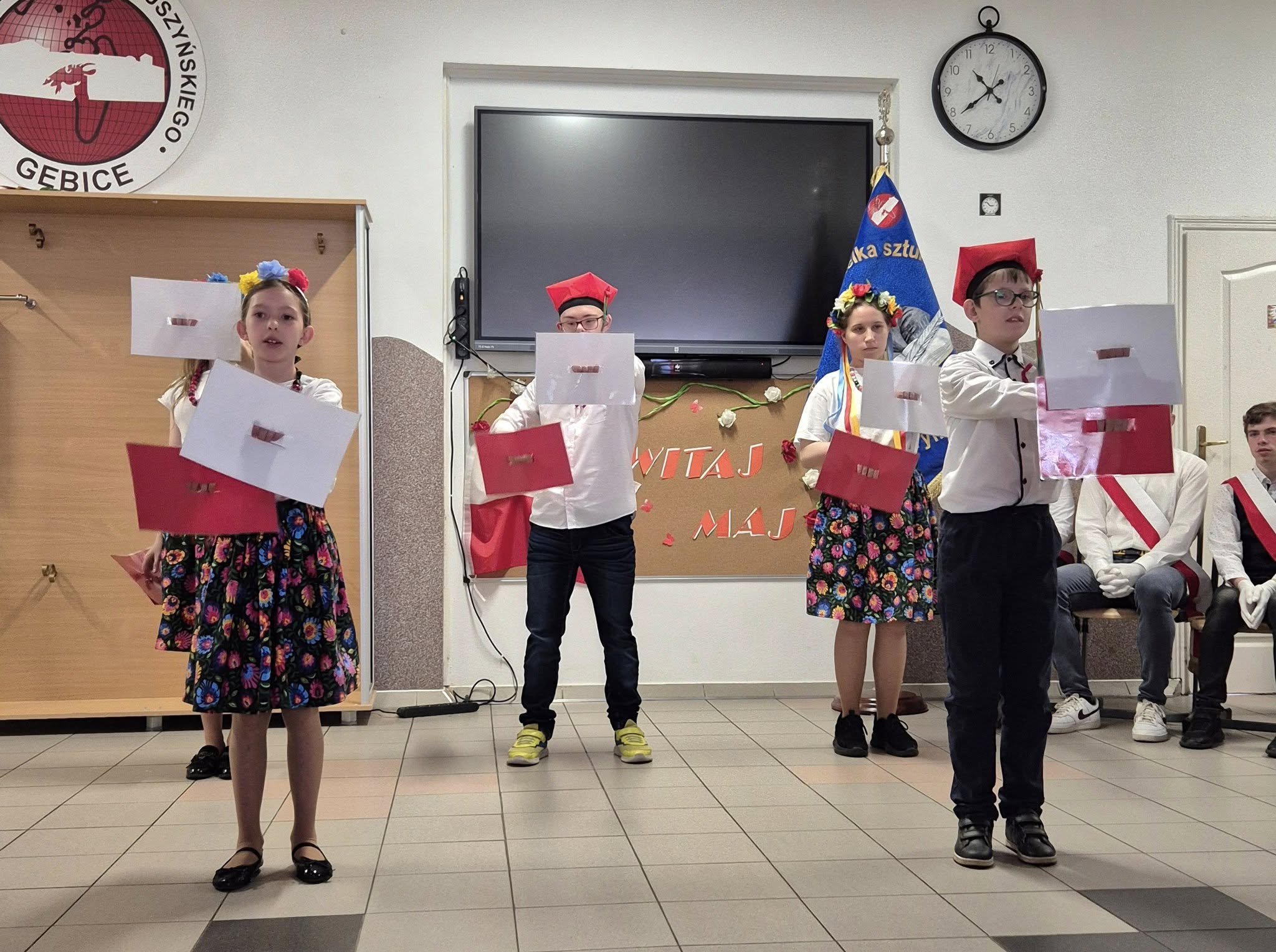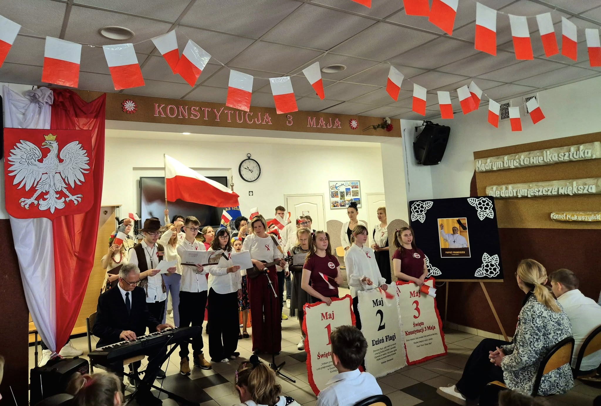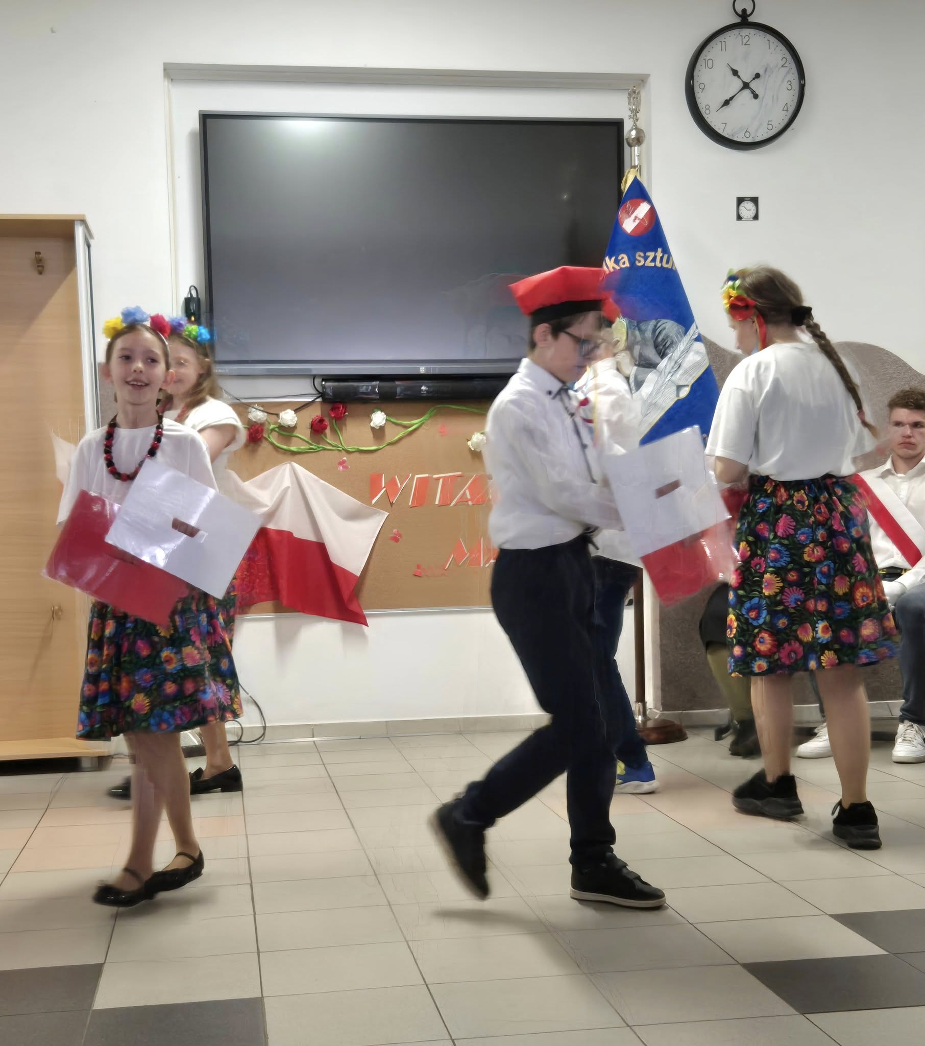 W przeddzień uroczystości majowych w naszej szkole odbyła się wyjątkowa akademia, która zgromadziła całą społeczność szkolną. Uroczystość rozpoczęła się od wprowadzenia pocztu sztandarowego i wspólnego zaśpiewania hymnu. Zaraz po tym na scenę wbiegły bliźniaczki, które poprowadziły pierwszą część apelu i przybliżyły nam znaczenie Majowych Świąt Narodowych. Były wiersze, polka oraz tańce. W kolejnej części programu uczniowie, przebrani za obcokrajowców, opowiadali o znaczeniu Konstytucji 3 Maja. Na scenie pojawiły się postacie takie jak kowboj, Eskimos, Indianin oraz Chinka i Masajka, co wzbudziło duże zainteresowanie i uśmiechy na twarzach publiczności. Uczniowie przypomnieli zebranym tradycje świąt majowych, podkreślając, jak ważne są dla naszej historii i tożsamości narodowej. Na zakończenie uroczystości wspólnie wykonano „Majową Jutrzenkę”. Był to piękny finał, który połączył wszystkich we wspólnym świętowaniu.