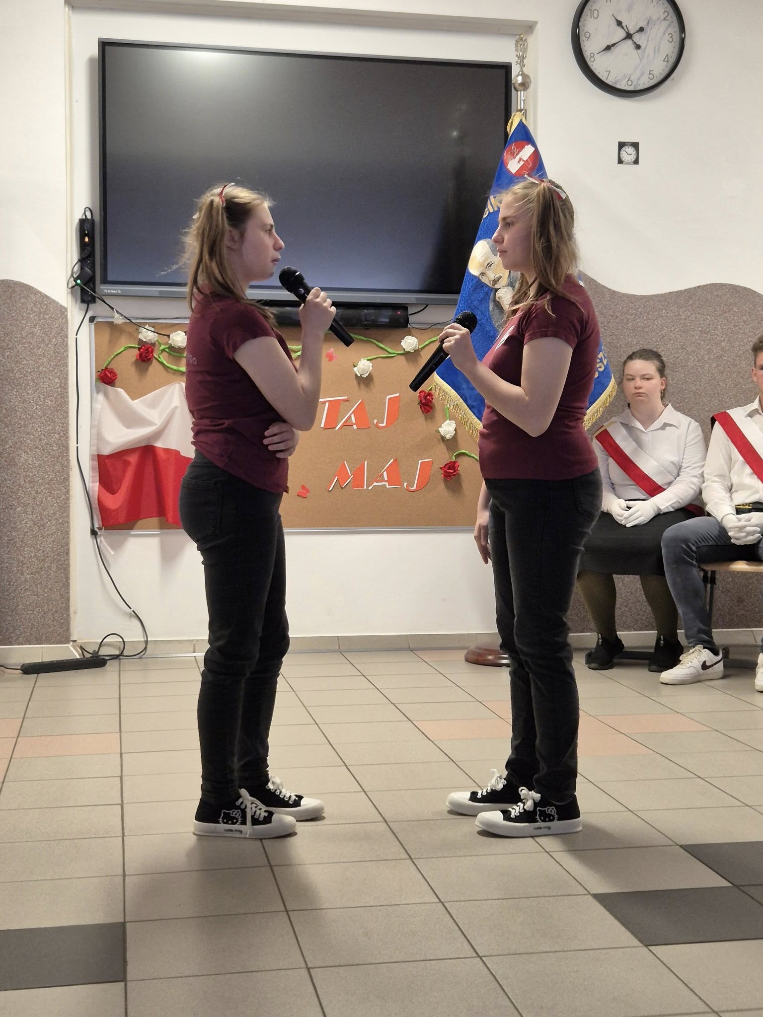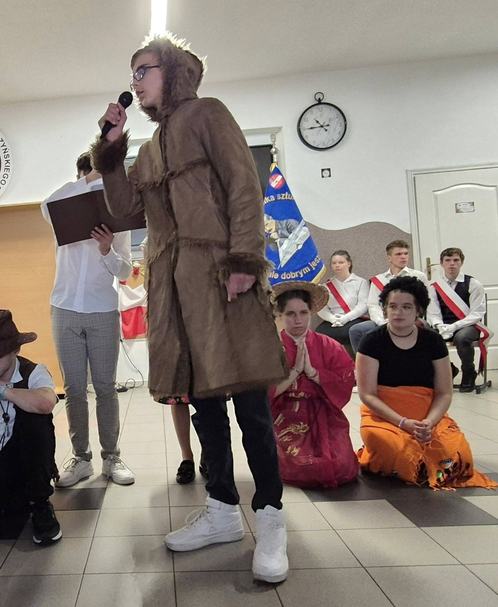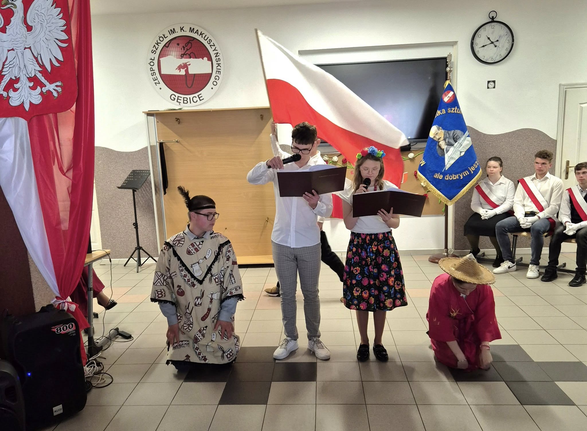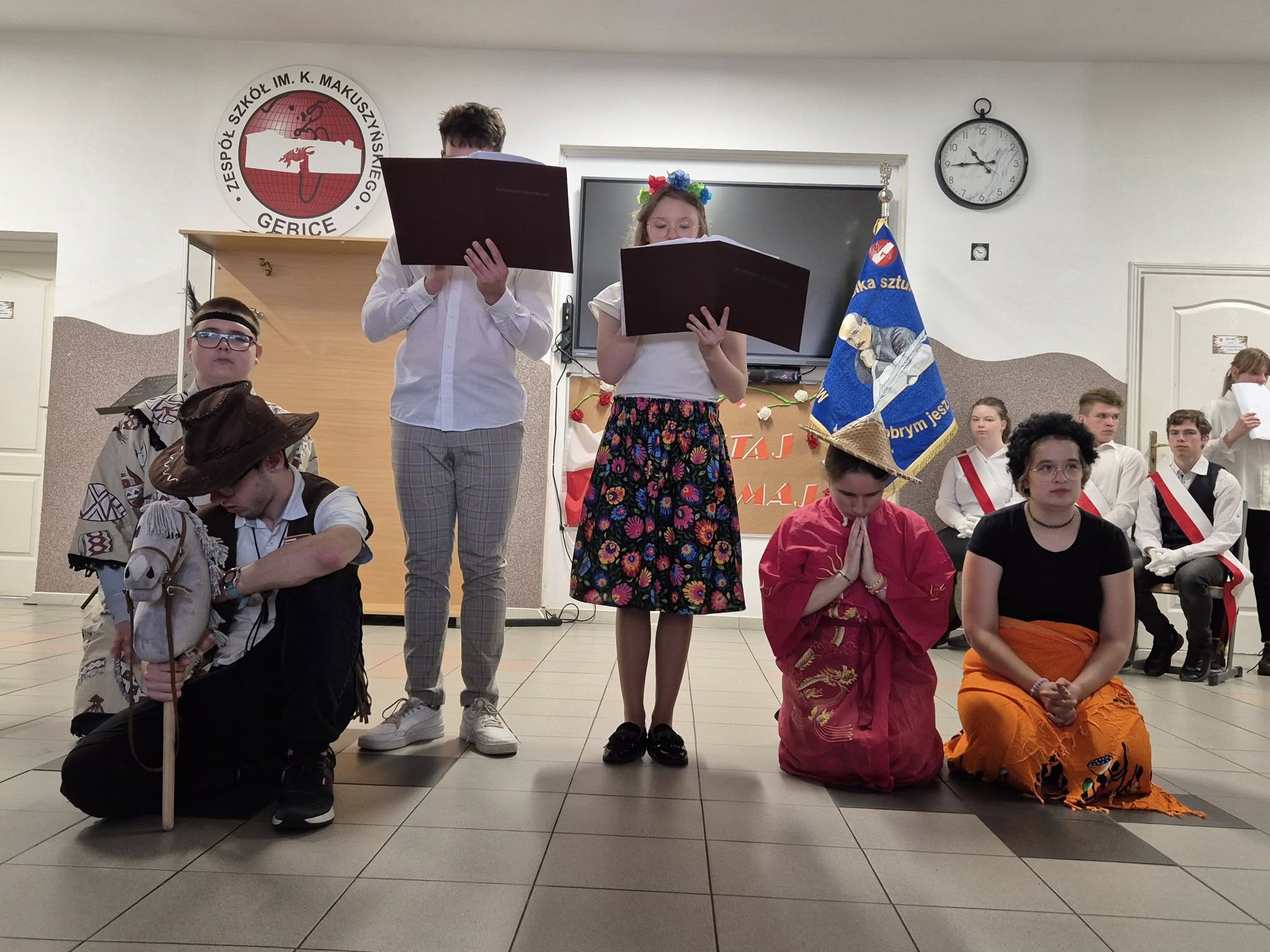 W przeddzień uroczystości majowych w naszej szkole odbyła się wyjątkowa akademia, która zgromadziła całą społeczność szkolną. Uroczystość rozpoczęła się od wprowadzenia pocztu sztandarowego i wspólnego zaśpiewania hymnu. Zaraz po tym na scenę wbiegły bliźniaczki, które poprowadziły pierwszą część apelu i przybliżyły nam znaczenie Majowych Świąt Narodowych. Były wiersze, polka oraz tańce. W kolejnej części programu uczniowie, przebrani za obcokrajowców, opowiadali o znaczeniu Konstytucji 3 Maja. Na scenie pojawiły się postacie takie jak kowboj, Eskimos, Indianin oraz Chinka i Masajka, co wzbudziło duże zainteresowanie i uśmiechy na twarzach publiczności. Uczniowie przypomnieli zebranym tradycje świąt majowych, podkreślając, jak ważne są dla naszej historii i tożsamości narodowej. Na zakończenie uroczystości wspólnie wykonano „Majową Jutrzenkę”. Był to piękny finał, który połączył wszystkich we wspólnym świętowaniu.