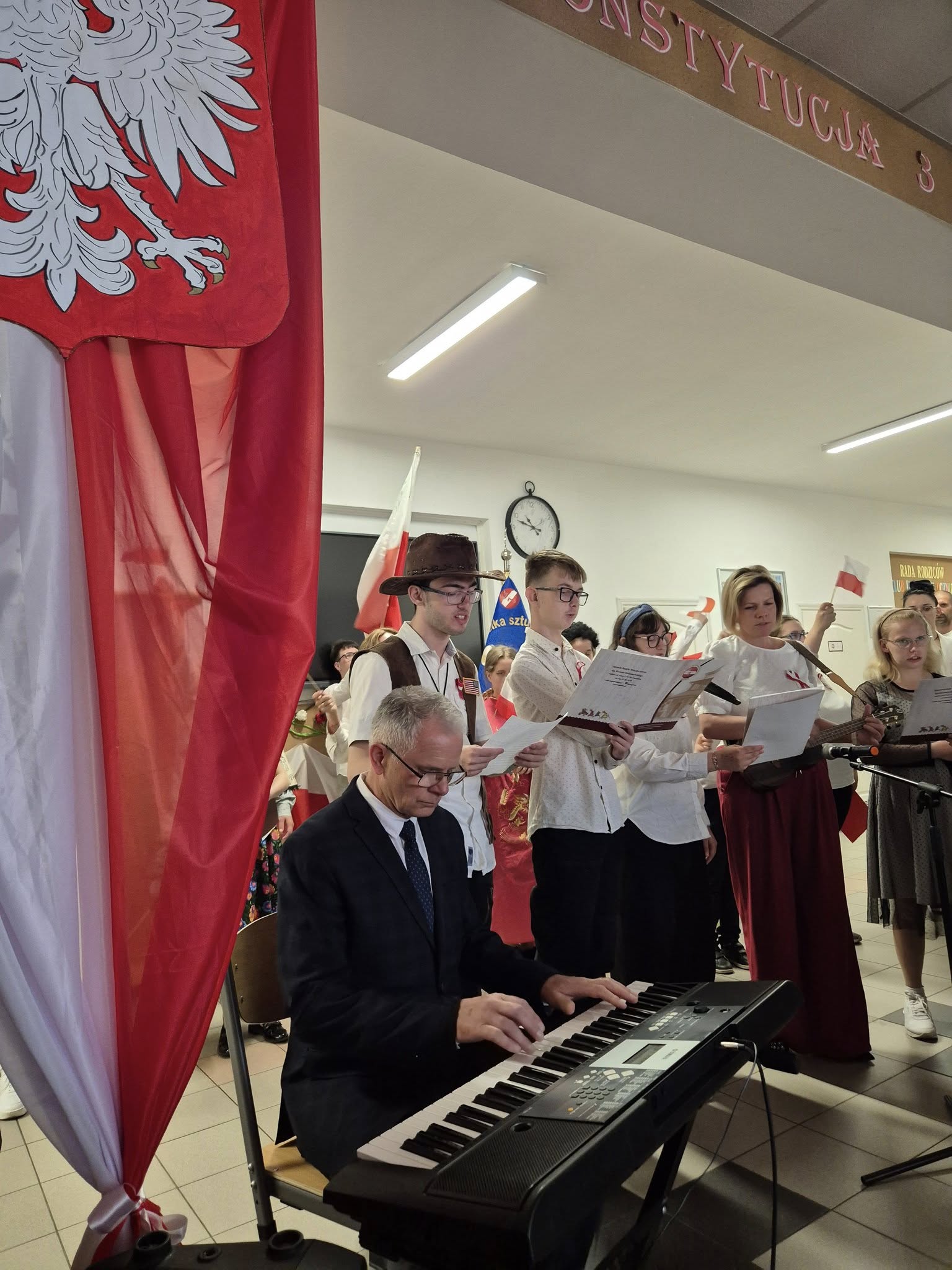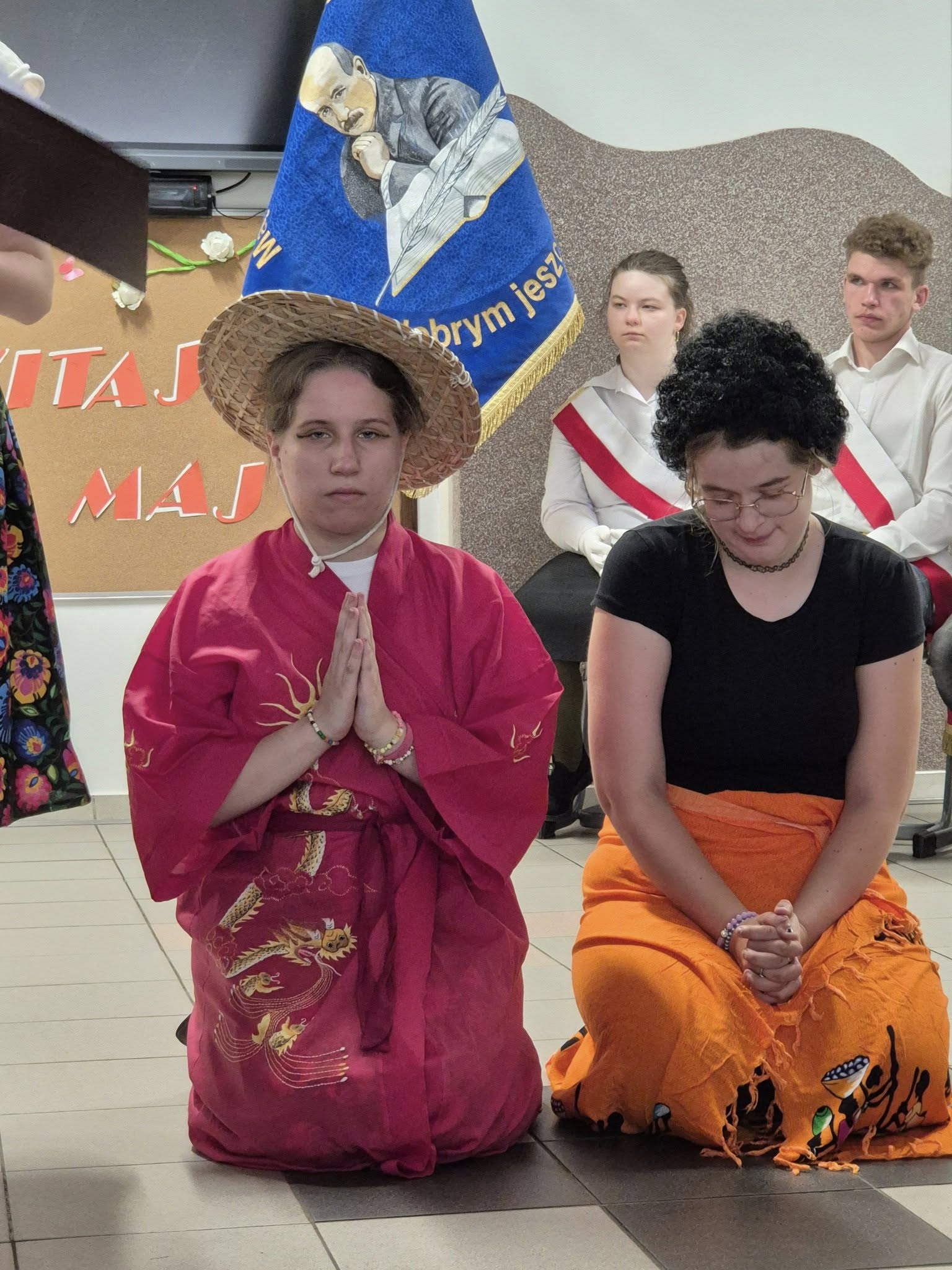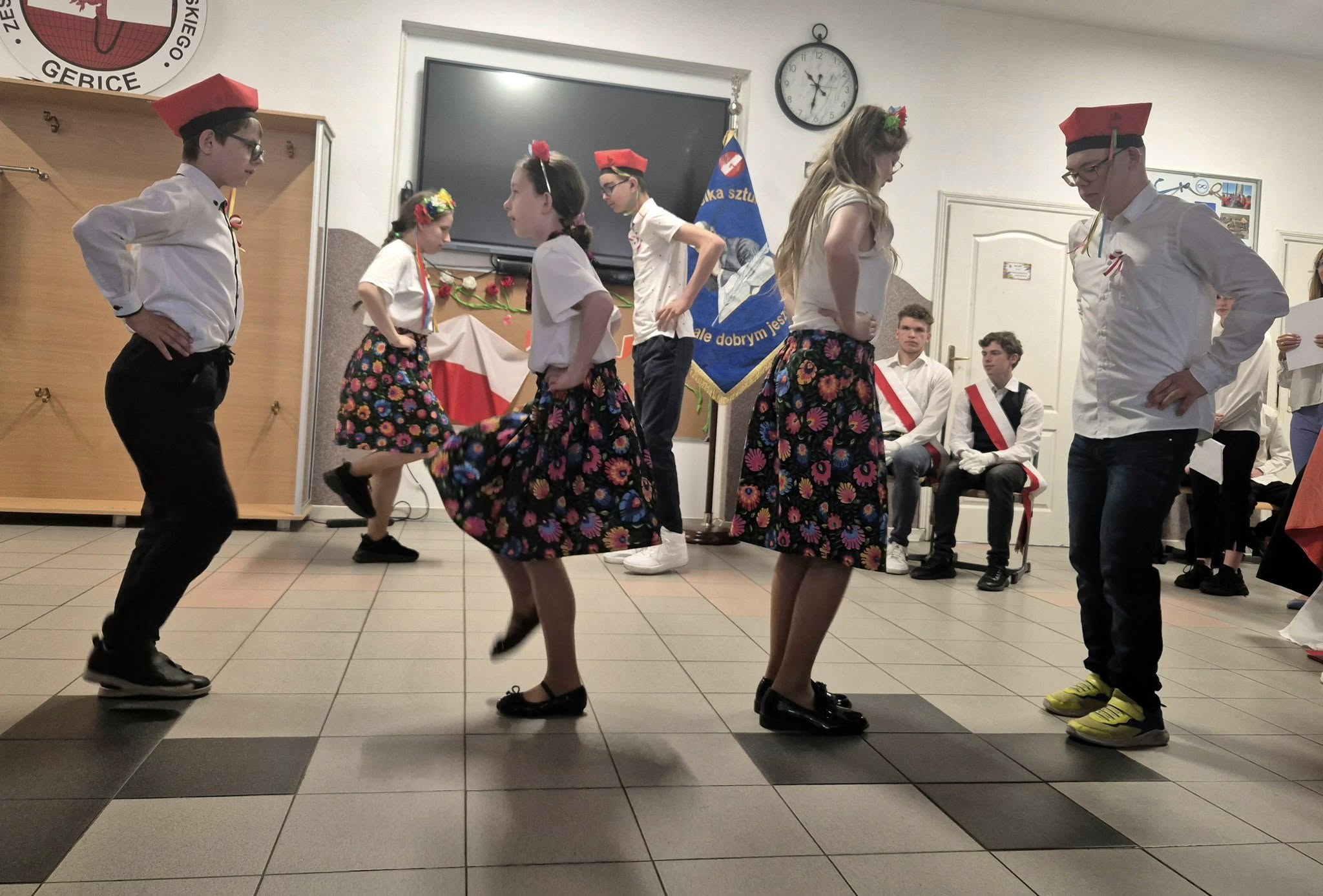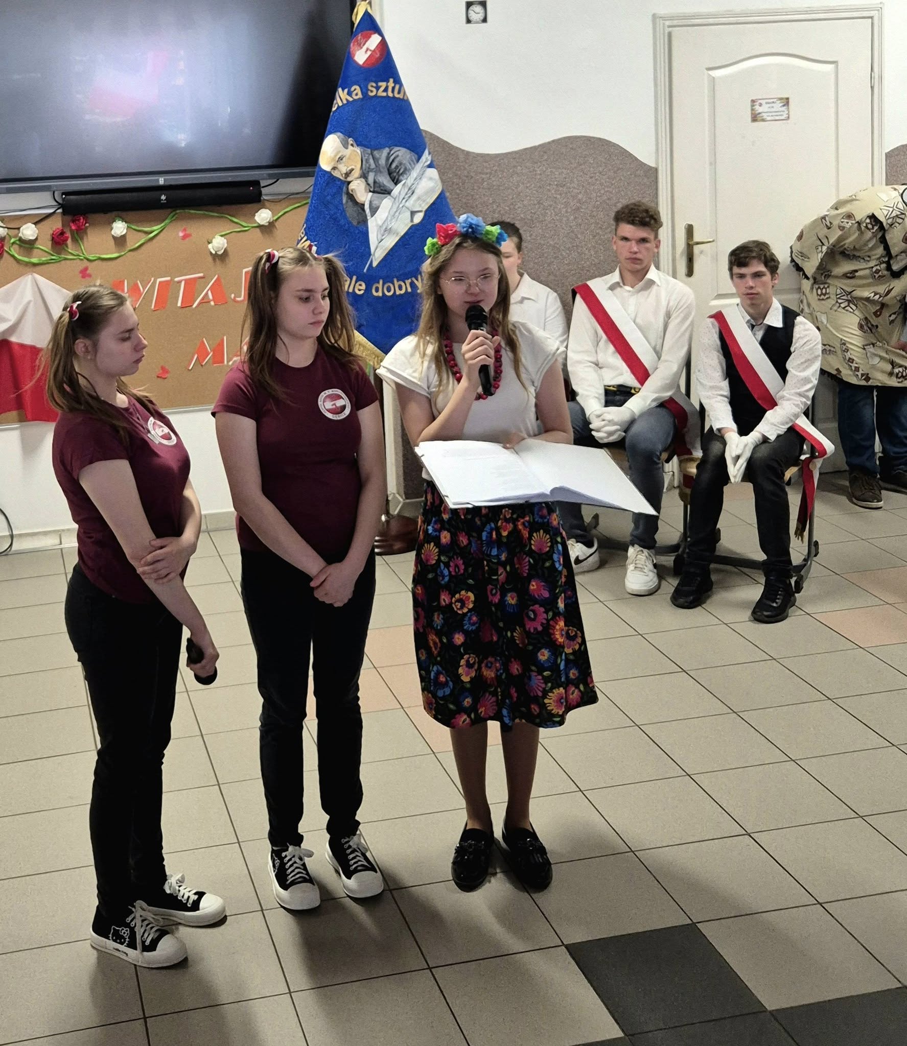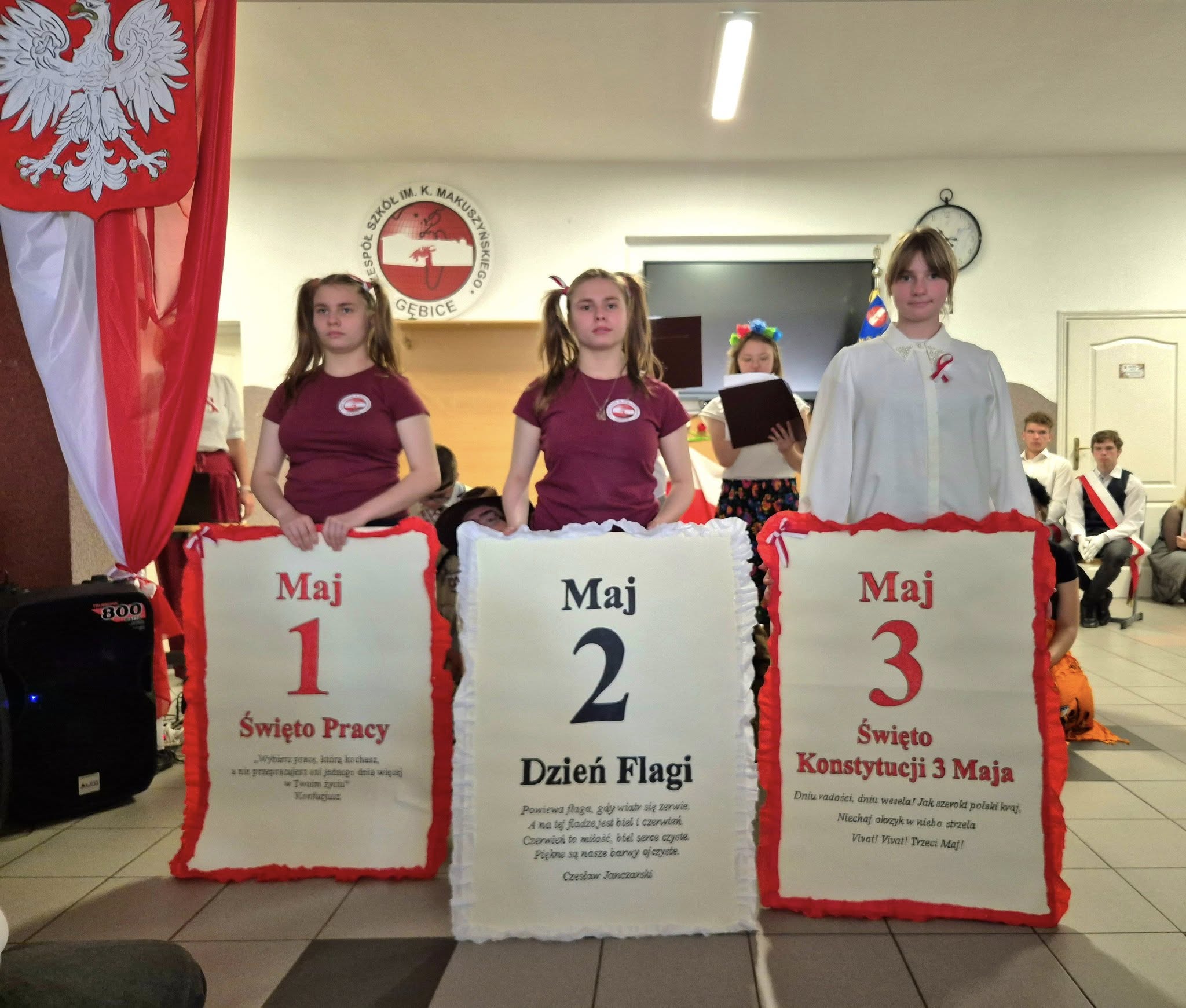 W przeddzień uroczystości majowych w naszej szkole odbyła się wyjątkowa akademia, która zgromadziła całą społeczność szkolną. Uroczystość rozpoczęła się od wprowadzenia pocztu sztandarowego i wspólnego zaśpiewania hymnu. Zaraz po tym na scenę wbiegły bliźniaczki, które poprowadziły pierwszą część apelu i przybliżyły nam znaczenie Majowych Świąt Narodowych. Były wiersze, polka oraz tańce. W kolejnej części programu uczniowie, przebrani za obcokrajowców, opowiadali o znaczeniu Konstytucji 3 Maja. Na scenie pojawiły się postacie takie jak kowboj, Eskimos, Indianin oraz Chinka i Masajka, co wzbudziło duże zainteresowanie i uśmiechy na twarzach publiczności. Uczniowie przypomnieli zebranym tradycje świąt majowych, podkreślając, jak ważne są dla naszej historii i tożsamości narodowej. Na zakończenie uroczystości wspólnie wykonano „Majową Jutrzenkę”. Był to piękny finał, który połączył wszystkich we wspólnym świętowaniu.