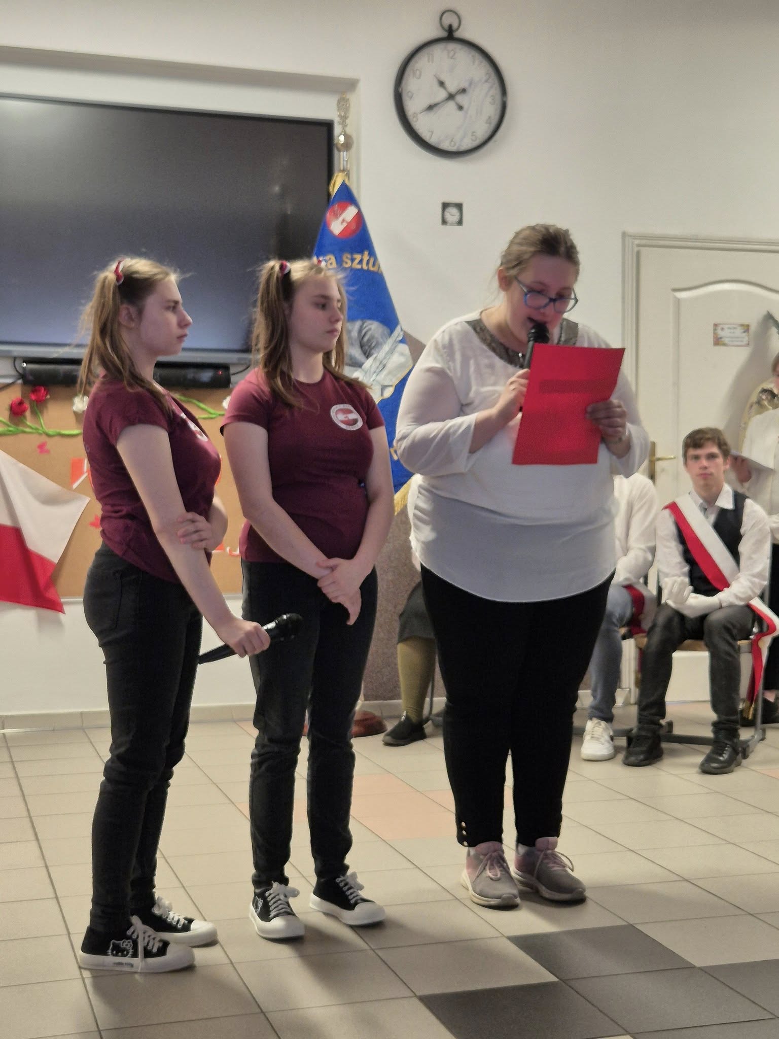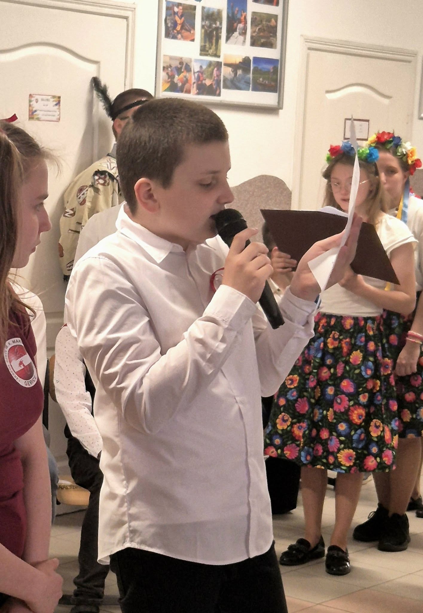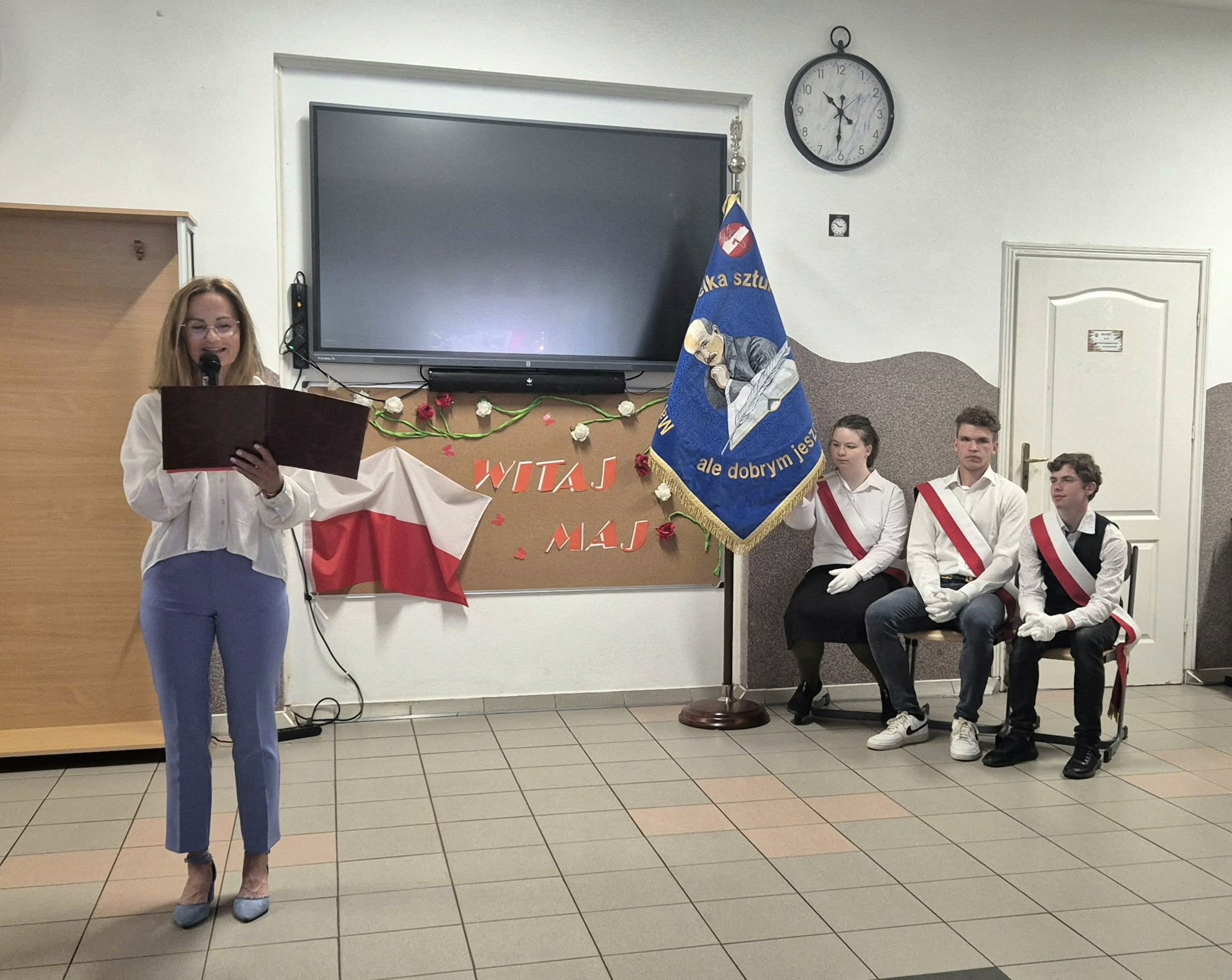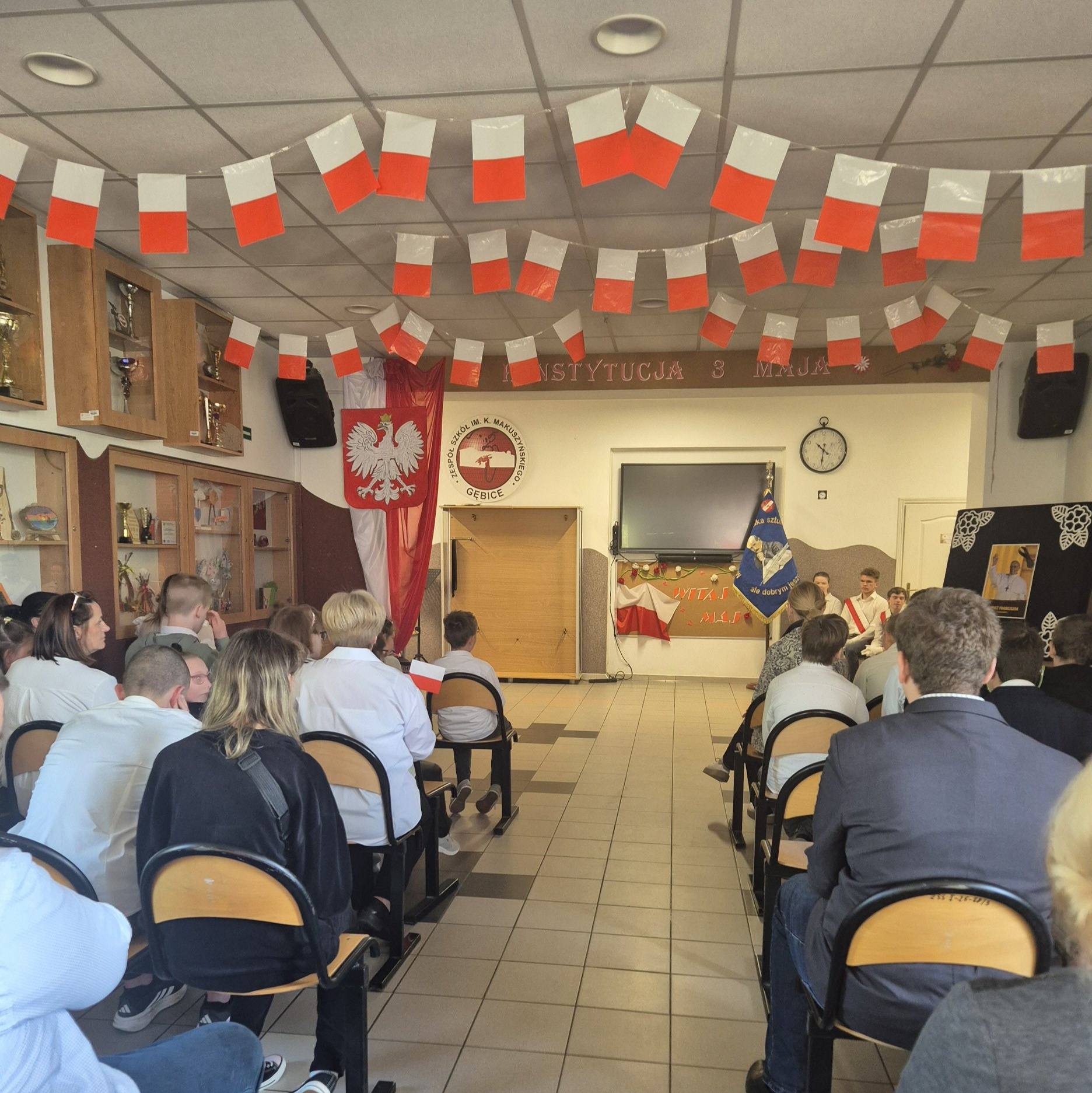 W przeddzień uroczystości majowych w naszej szkole odbyła się wyjątkowa akademia, która zgromadziła całą społeczność szkolną. Uroczystość rozpoczęła się od wprowadzenia pocztu sztandarowego i wspólnego zaśpiewania hymnu. Zaraz po tym na scenę wbiegły bliźniaczki, które poprowadziły pierwszą część apelu i przybliżyły nam znaczenie Majowych Świąt Narodowych. Były wiersze, polka oraz tańce. W kolejnej części programu uczniowie, przebrani za obcokrajowców, opowiadali o znaczeniu Konstytucji 3 Maja. Na scenie pojawiły się postacie takie jak kowboj, Eskimos, Indianin oraz Chinka i Masajka, co wzbudziło duże zainteresowanie i uśmiechy na twarzach publiczności. Uczniowie przypomnieli zebranym tradycje świąt majowych, podkreślając, jak ważne są dla naszej historii i tożsamości narodowej. Na zakończenie uroczystości wspólnie wykonano „Majową Jutrzenkę”. Był to piękny finał, który połączył wszystkich we wspólnym świętowaniu.