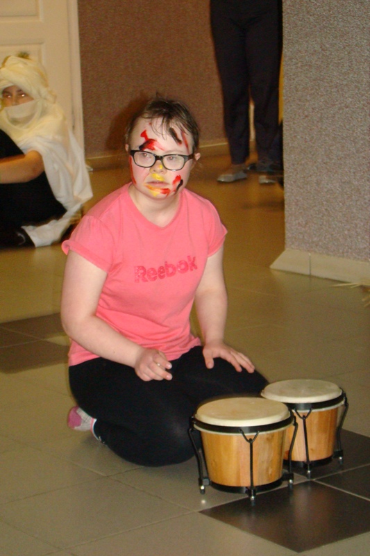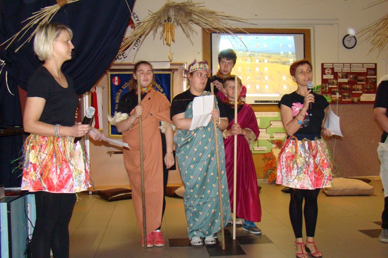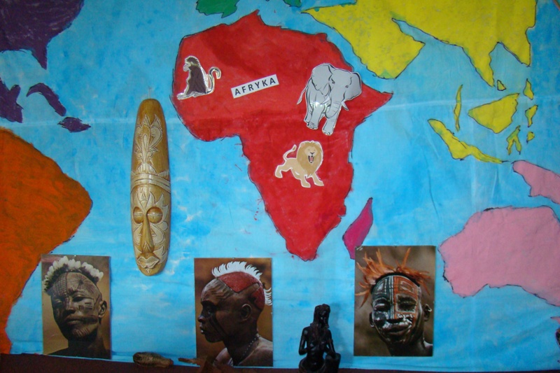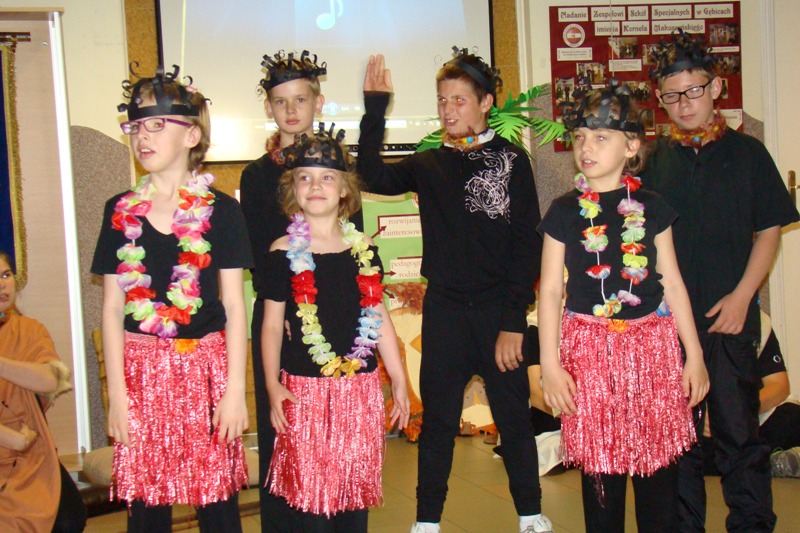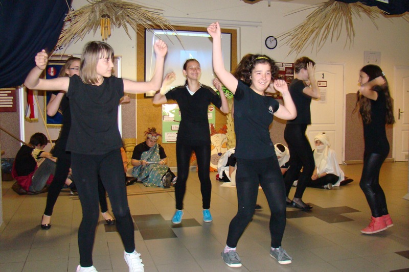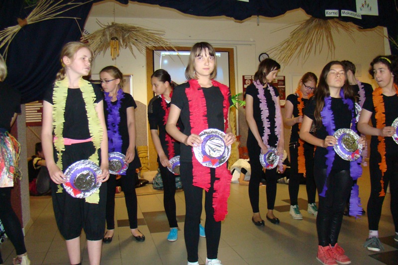 Pośród bujnej roślinności i mnogości zwierząt dżungli na szkolnym korytarzu rozbrzmiewała afrykańska muzyka, przy dźwiękach której uczniowie zaprezentowali się w kilku tańcach plemion afrykańskich, a widownia całym sercem poddała się atmosferze i rytmom, którymi na co dzień oddycha Afryka.