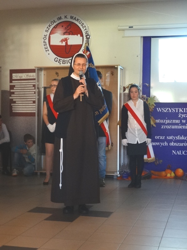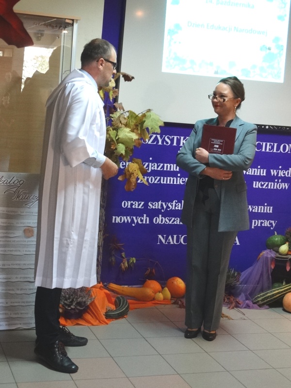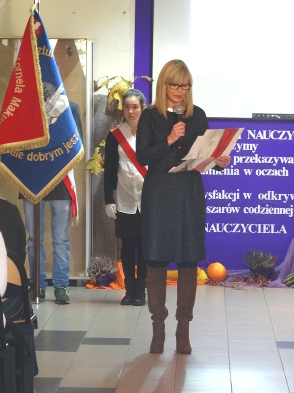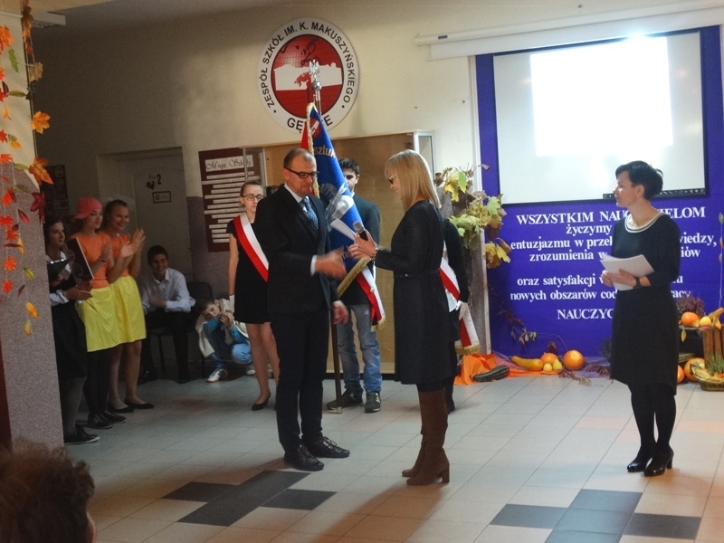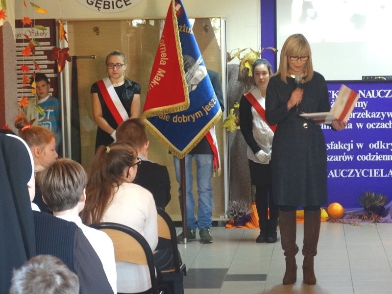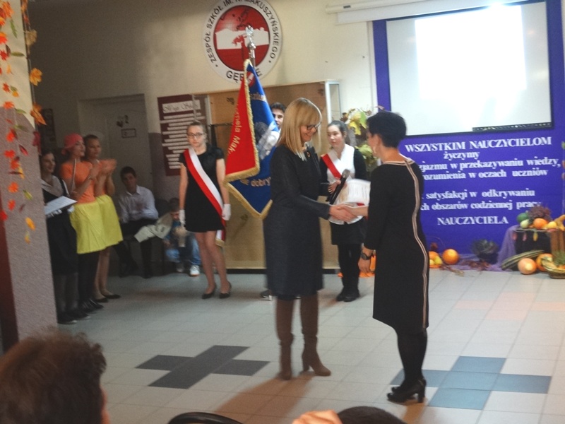 W części oficjalnej wprowadzono sztandar szkoły, odśpiewano Hymn Państwowy. Następnie głos zajęła pani dyrektor Alicja Kasperczak, a później życzenia swoim nauczycielom złożyli uczniowie. Nie zabrakło również drobnych upominków i laurek. Po odśpiewaniu Hymnu Szkoły i wyprowadzeniu sztandaru, przyszedł czas na herbatę, kawę, słodkości i …bitwę…