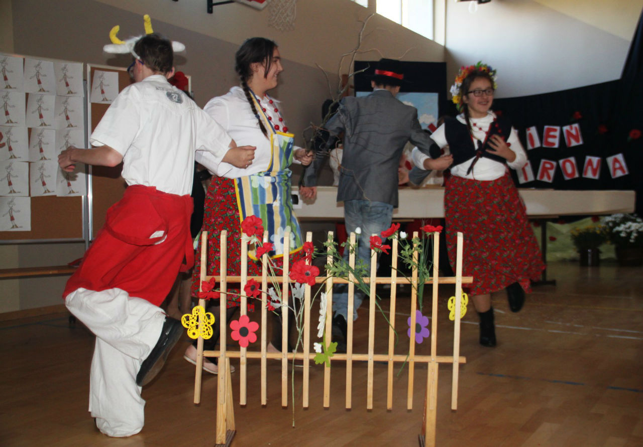 Podczas bloku rozrywkowego postanowiliśmy wpisać się w konwencję programu telewizyjnego „Kocham Cię Polsko". Wyłonione drużyny, na których czele stanęły przedstawicielki Rady Rodziców, panie: Agnieszka Tetzlaff i Sylwia Filoda, odpowiadały na pytania związane z twórczością K. Makuszyńskiego. Wygrana drużyna dostąpiła zaszczytu rozczęstowania wśród obecnych na sali „prawie marcińskich" rogali. Swój talent zaprezentowały również dzieci przygotowane przez panią Wiolettę Michalską w tańcu „Koza beczy".