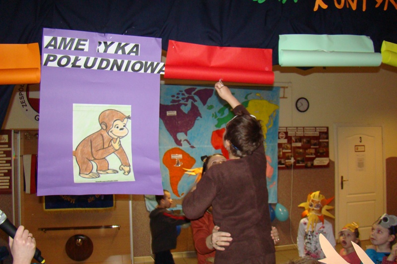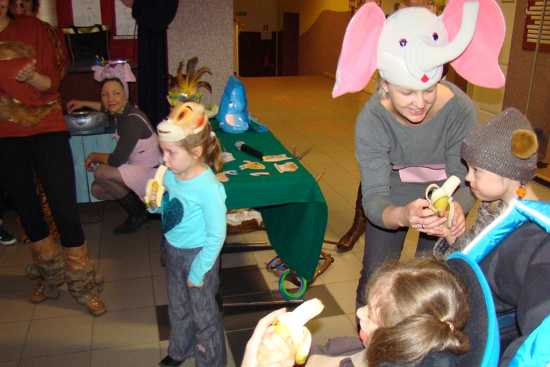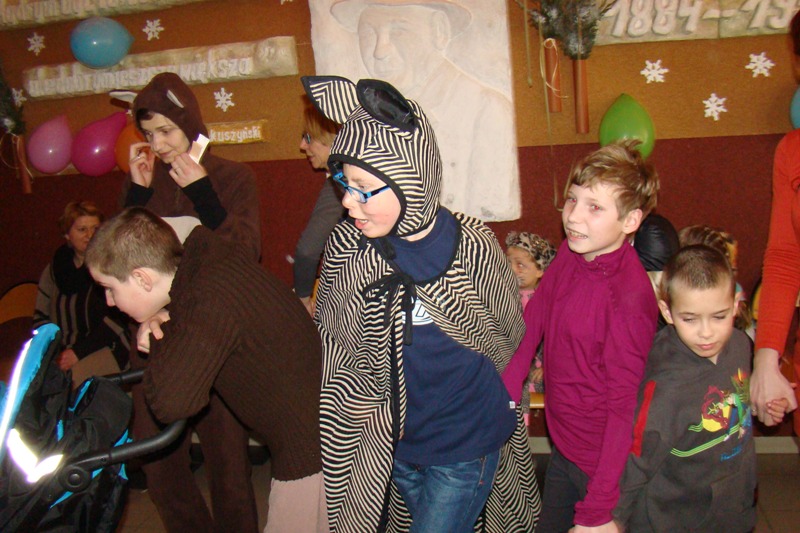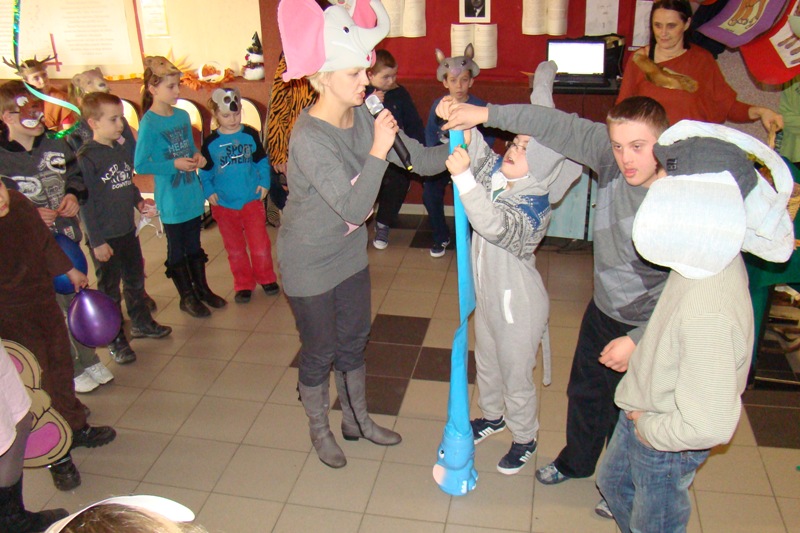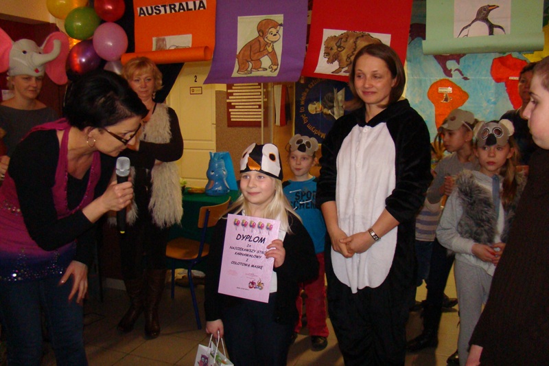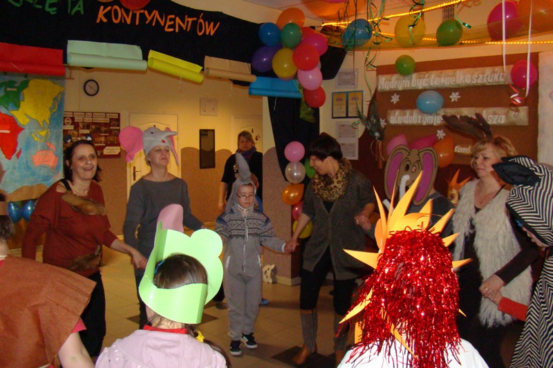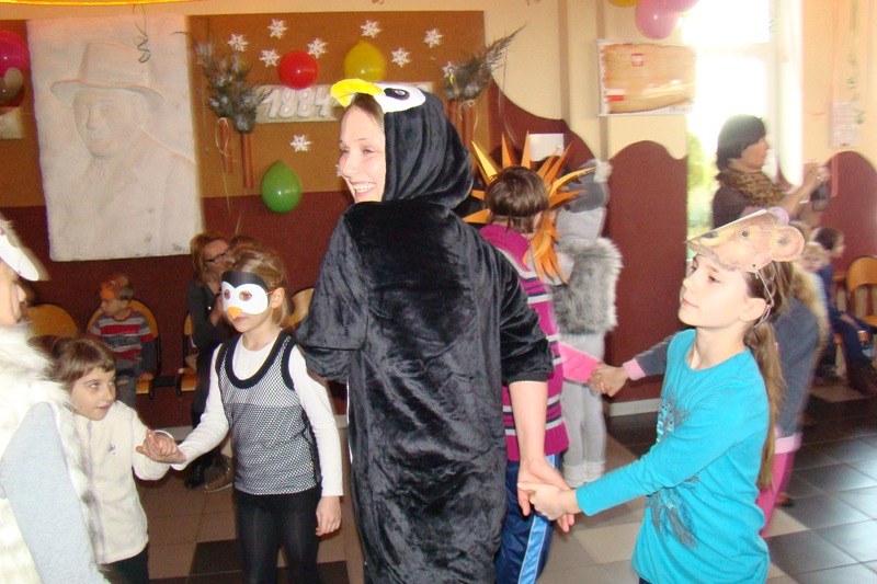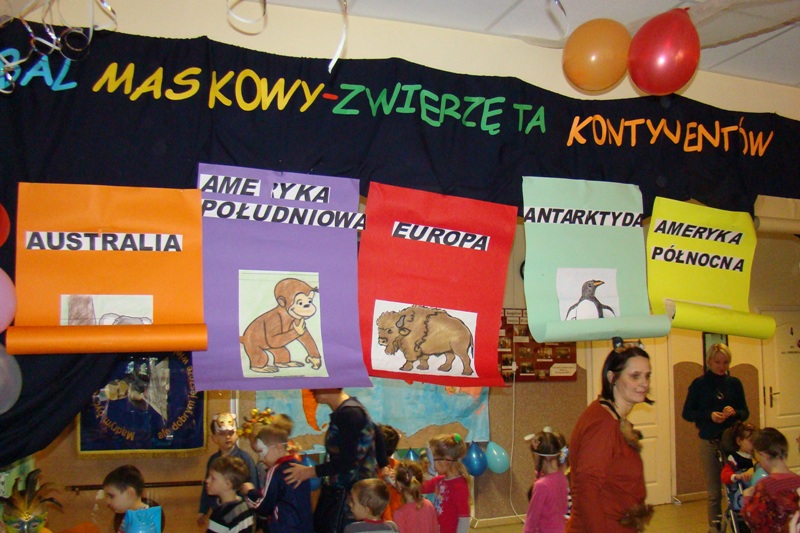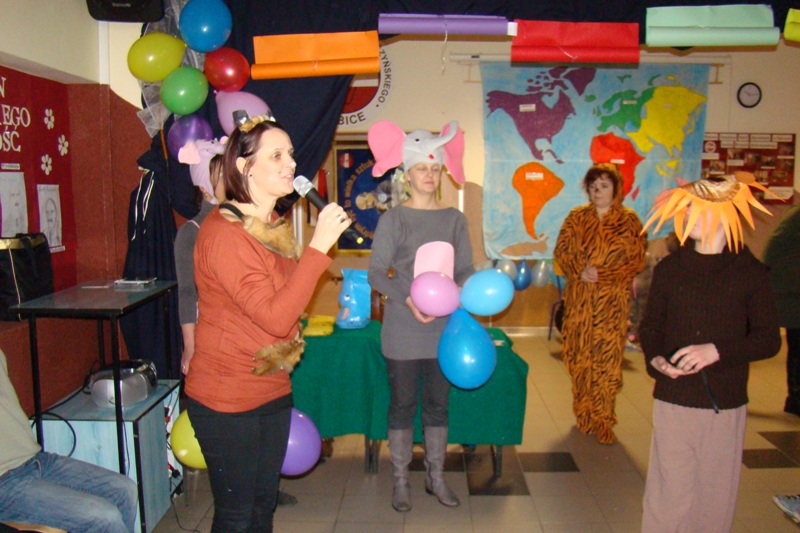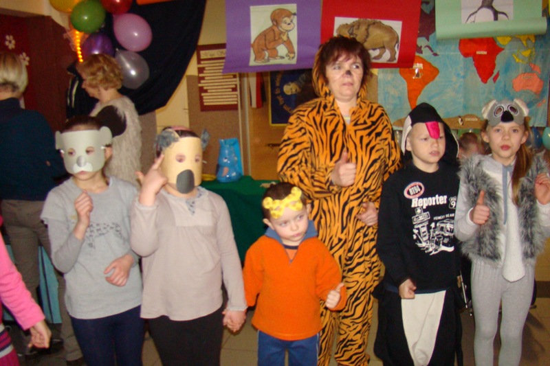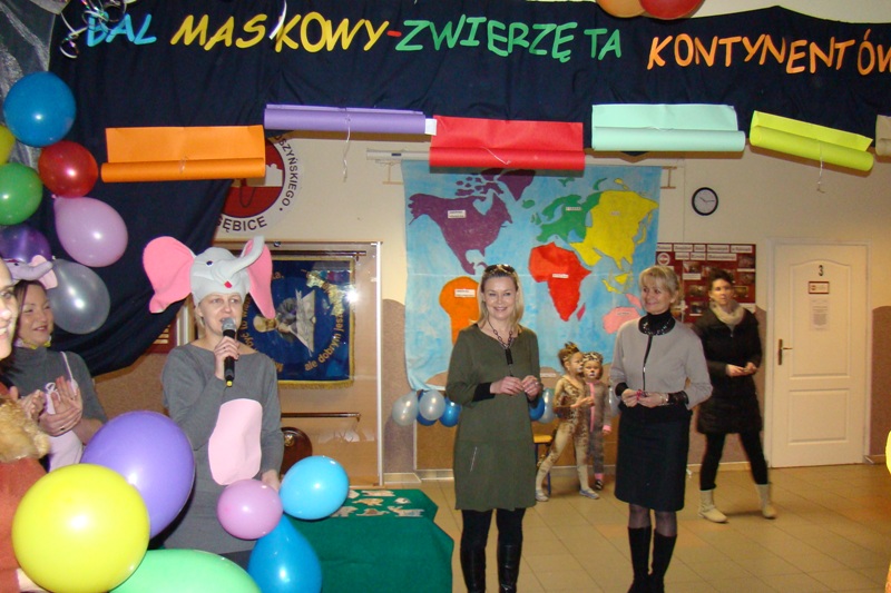 Na bal uczniowie przybyli w pięknych i oryginalnych strojach, przedstawiających różne zwierzęta zamieszkujące wszystkie kontynenty naszego globu. We wspólnym tańcu można było zobaczyć małpki, słonie, pingwiny, lwy, jelenie, niedźwiedzie i misie koala. W rytmie największych przebojów, prezentowanych przez DJ, wszyscy bawili się doskonale. Oddechem w tańcu okazały się, przygotowane przez organizatorki balu: p. Agnieszkę Roszak, p. Iwonę Lokert, p. Karolinę Rybarczyk, p. Annę Korczyc i p. M. Fąka, liczne konkursy, które tematycznie nawiązywały do hasła balu. Szczególnym zainteresowaniem cieszyły się konkurencje: najgłośniejszy ryk lwa, rzuty ringo na poroże jelenia, zjadanie bananów na czas, taniec pingwina czy polowanie na starego niedźwiedzia. Zwycięzców obdarowywano czekoladkami i cukierkami .