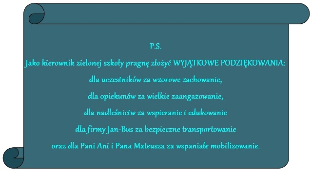 Spokojną atmosferę w autokarze z rzadka przerywało zmęczenie, a częściej promienie słońca i fale radości. Przecież to już druga zielona szkoła. Tym razem było spokojniej, bo większość uczestników już domyślała się, co ich czeka, a ci którzy jechali pierwszy raz już zdążyli wszystkiego dowiedzieć się z „wywiadu” w autokarze.