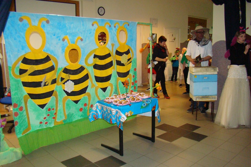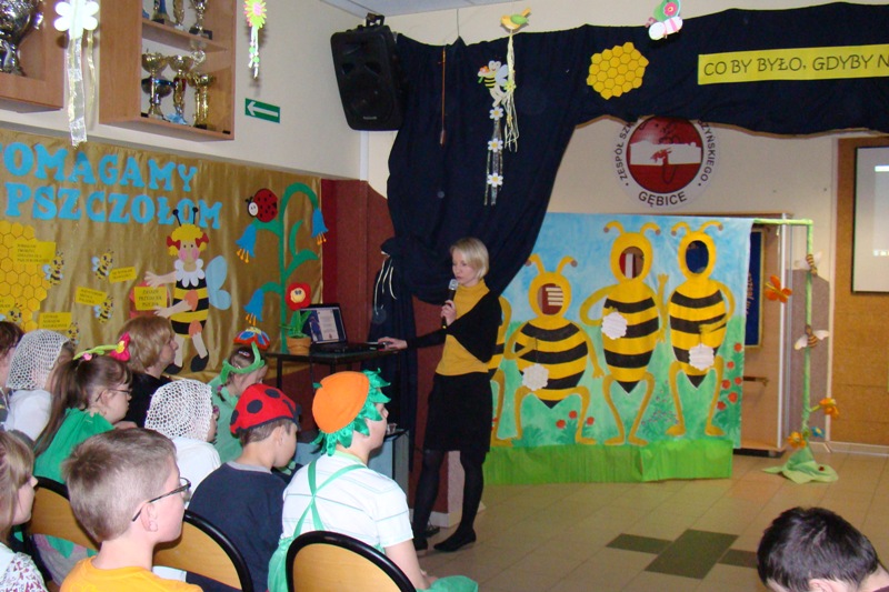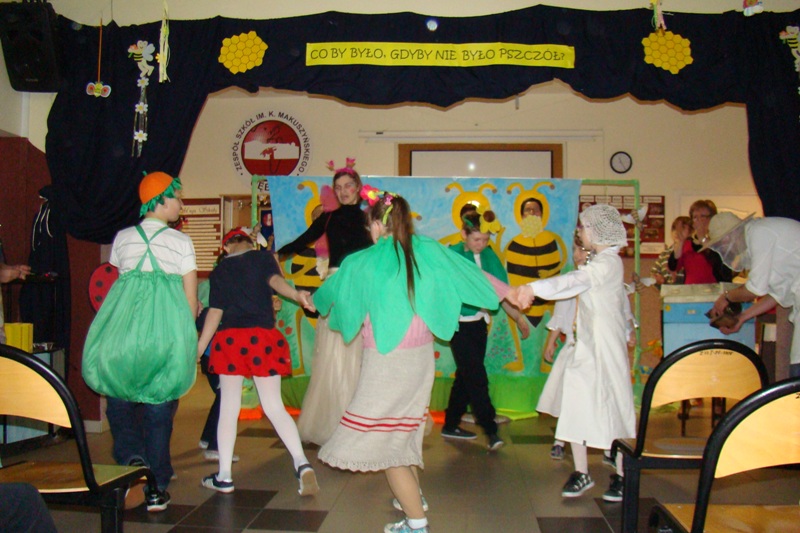 Uwieńczeniem całego projektu było zorganizowanie uroczystości szkolnej pod hasłem: ?Co by było gdyby nie było pszczół??. Zaproszono zaprzyjaźnionego pszczelarza, który jeszcze raz w szerszym gronie opowiedział o swojej pasji. Była to doskonała okazja, aby nasz gość odpowiedział na pytania, które padły z ust naszych uczniów. Podsumowując całą wiedzę dotyczącą znaczenia pszczół w ekosystemie najmłodsi uczniowie wspólnie z nauczycielami wystąpili w przedstawieniu pt. ?Co by było, gdyby nie było pszczół??. Na zakończenie spotkania uczniowie skosztowali babeczki na modzie upieczone przez dzieci z klas I-III wraz z wychowawczynią. Dotychczasowe zainteresowanie się tematem sprawiło, że będziemy kontynuować działania na rzecz pomagania pszczołom, które jak się dowiedzieliśmy są bardzo ważne i pożyteczne.