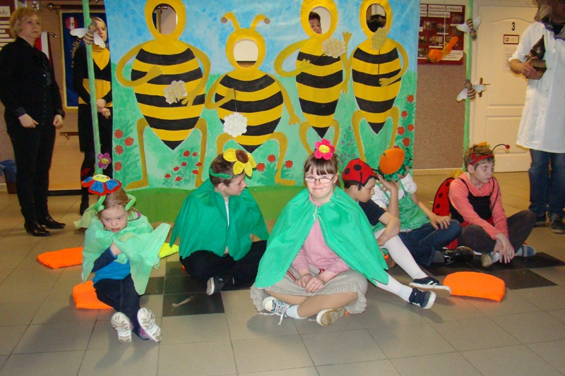 Natomiast uczniowie z niepełnosprawnością intelektualną w stopniu umiarkowanym z klasy VI na zajęciach z techniki wykonali plastry miodu z papieru, kolorowali rysunki konturowe pszczół oraz wykonali pszczoły z brystolu, którymi ozdobili klasę. W sali lekcyjnej umieszczono gazetkę ścienną z informacjami na temat budowy pszczół ,ich znaczenia w przyrodzie oraz środowiska życia.