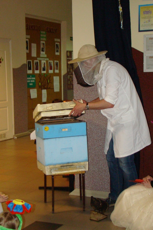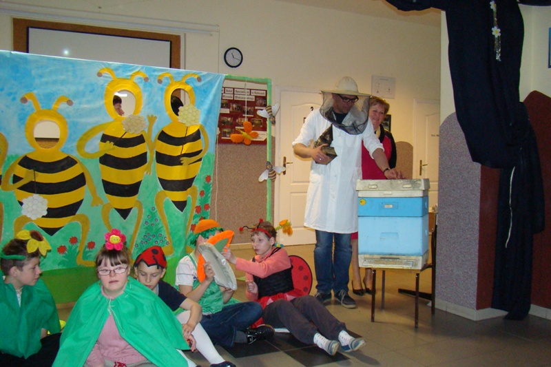 8 kwietnia zorganizowano wycieczkę do pasieki w Jędrzejewie. Nasi wychowankowie mieli okazję zaobserwować pierwsze wyloty pszczół z ula na kwitnące już śliwy. Właściciel pasieki ?pszczelarz omówił szczegółowo etapy życia owadów i różne rodzaje kwiatów rosnące w jego ogrodzie. Miłą niespodzianką było poczęstowanie uczestników wycieczki ciastem wypiekanym na miodzie i twarogiem polanym miodem z dzbanuszka oraz otrzymanie słoiczka miodu, figurek z wosku pszczelego i nasion roślin miododajnych, które będziemy mogli wysiać w pobliżu wykonanych domków dla pszczół.