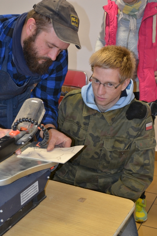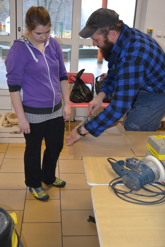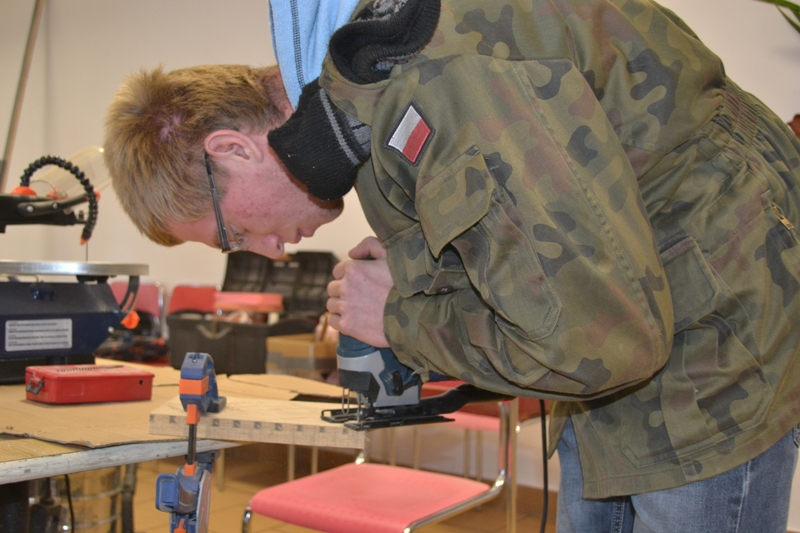 Sandra Cholewińska - uczennica gimnazjum oraz Grzegorz Kopeczek - uczeń szkoły przysposabiającej do pracy pracowali z zaangażowaniem i dużą przyjemnością. Sandra wykonała rzeczy, które będą prezentami pod choinkę: serce z drewna orzecha włoskiego oraz wieszak - serce z deski dębowej. Przedmioty te pokryła olejem i woskiem do drewna, podkreślając szlachetny wygląd materiału, jakim jest drewno. Grzegorz miał okazję pracować, korzystając z urządzeń mechanicznych, np. szlifierki oscylacyjnej, wyrzynarki ręcznej oraz bardzo precyzyjnej wyrzynarki stacjonarnej. Dało mu to dużo satysfakcji. Uczniowie naszej szkoły z zapałem pracowali od pierwszej do ostatniej minuty zajęć, a ich działaniom przyglądał się p. Grzegorz Rączka, który chwalił swoich podopiecznych za zaangażowanie i profesjonalizm.