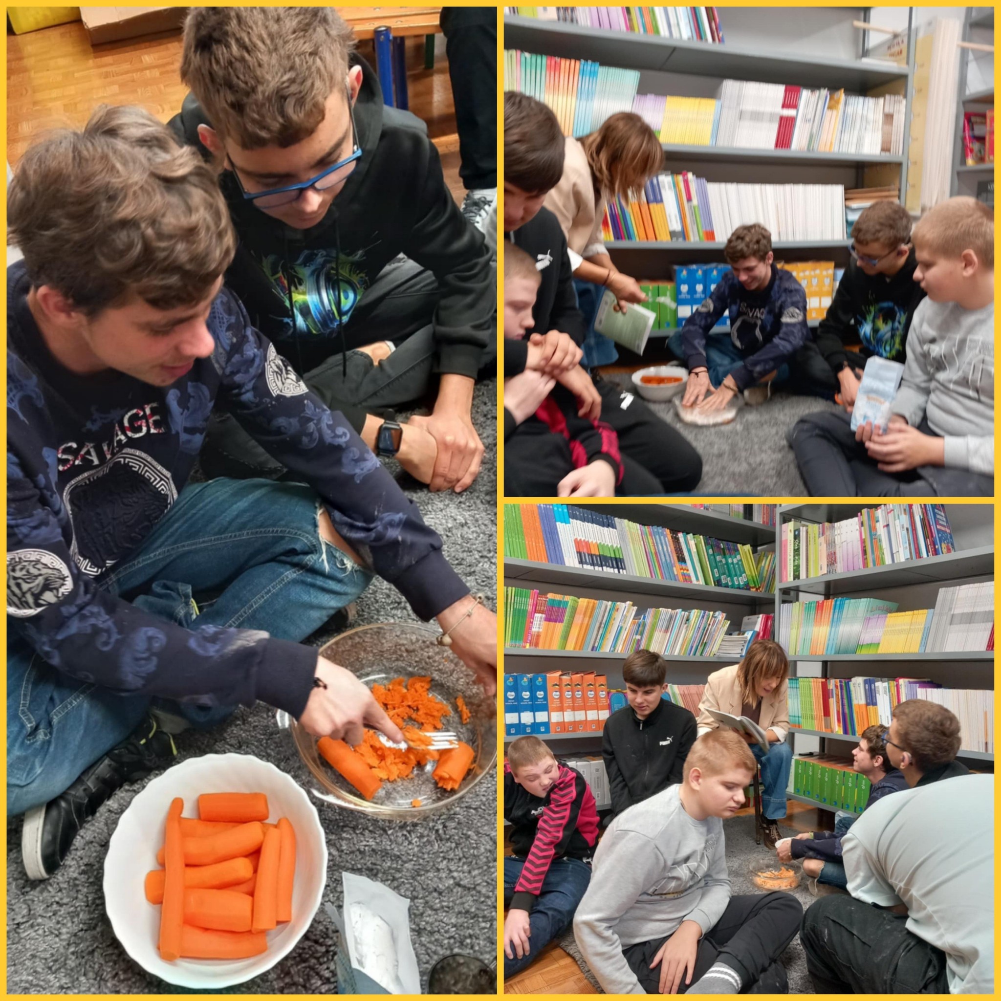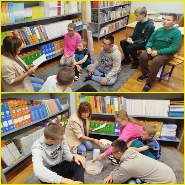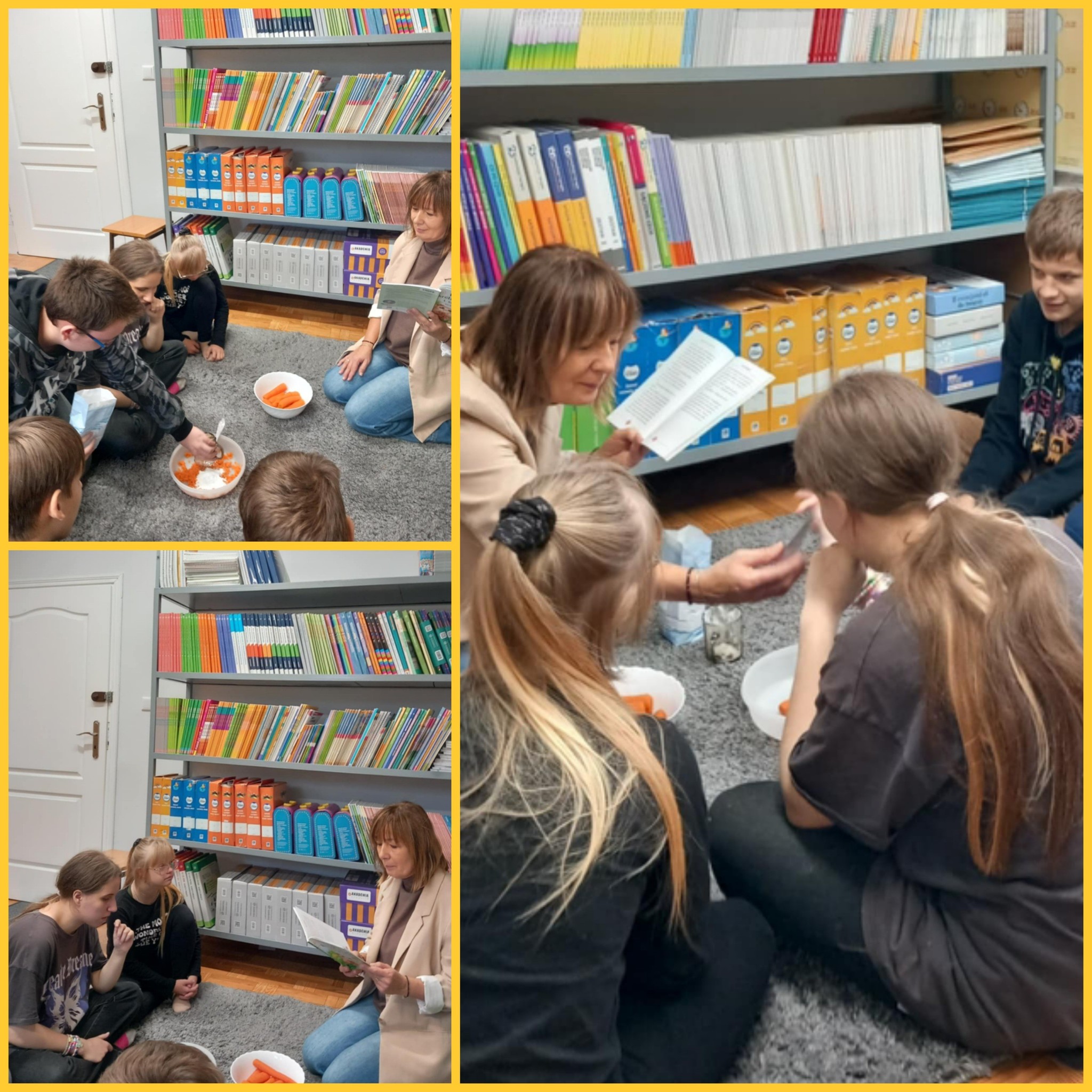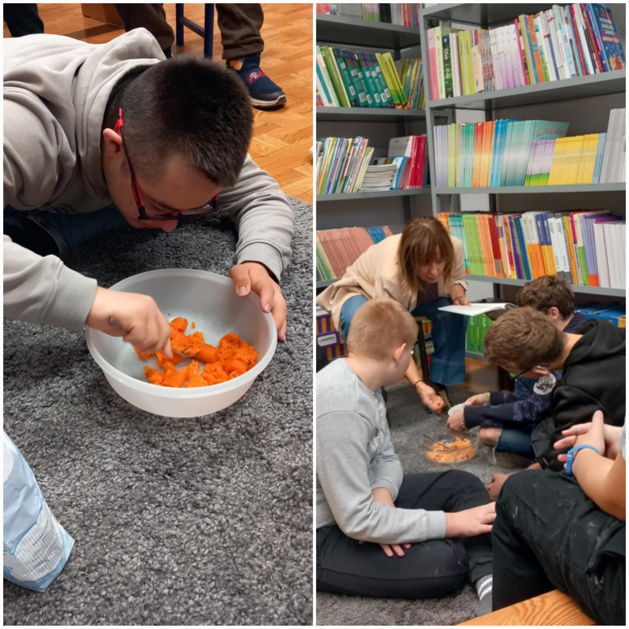 Drugie spotkanie w ramach akcji CZYTANIE NA DYWANIE, to kolejna sensoryczna przygoda, tym razem dotyk. Podczas czytania nauczyciela uczniowie przygotowywali dwuskładnikową masę na bazie marchwi, którą mogli dotykać, ściskać, ugniatać, modelować.